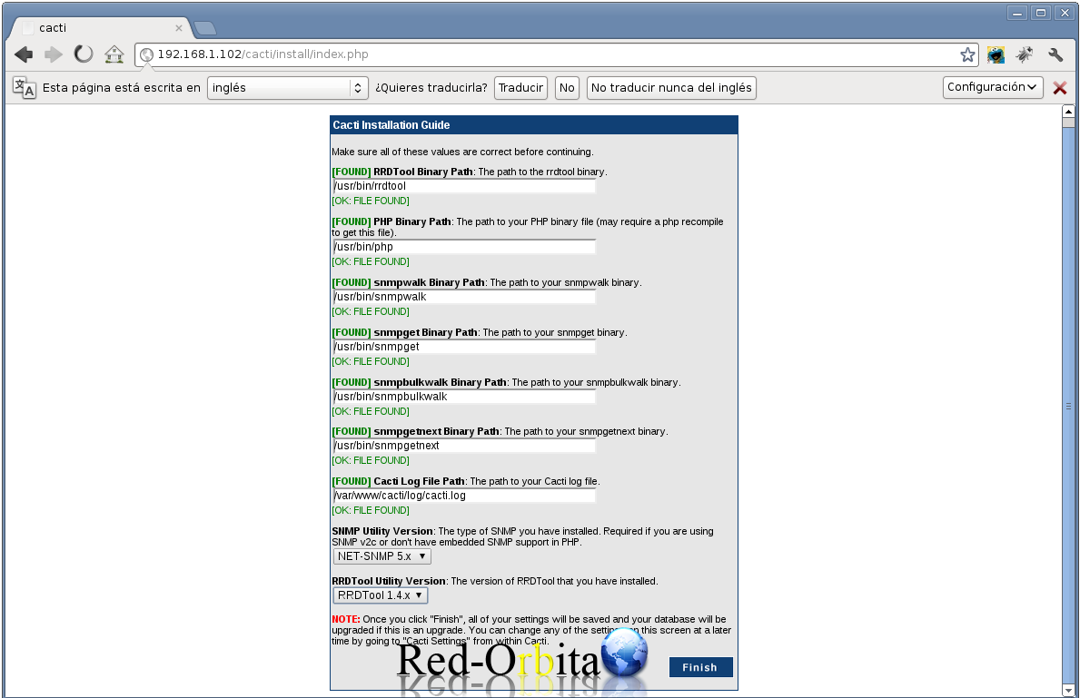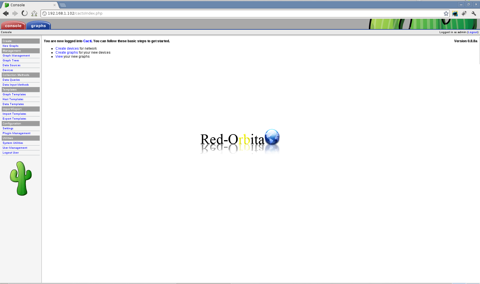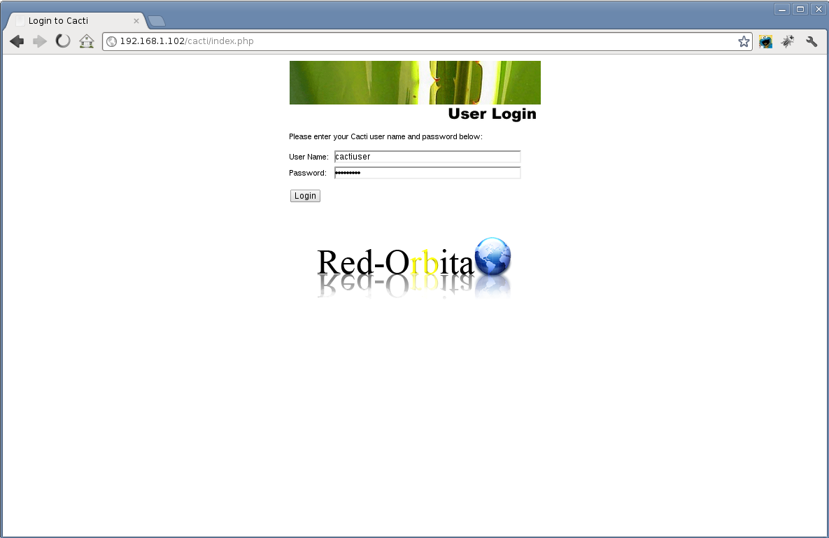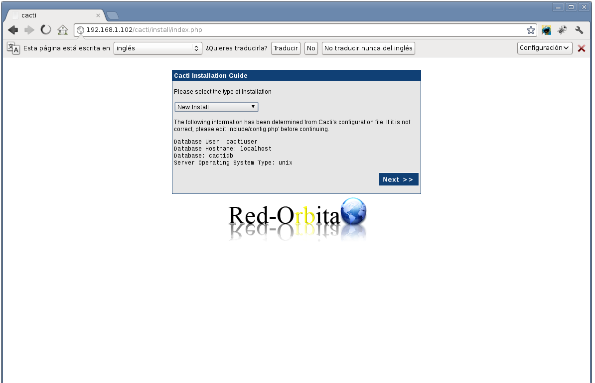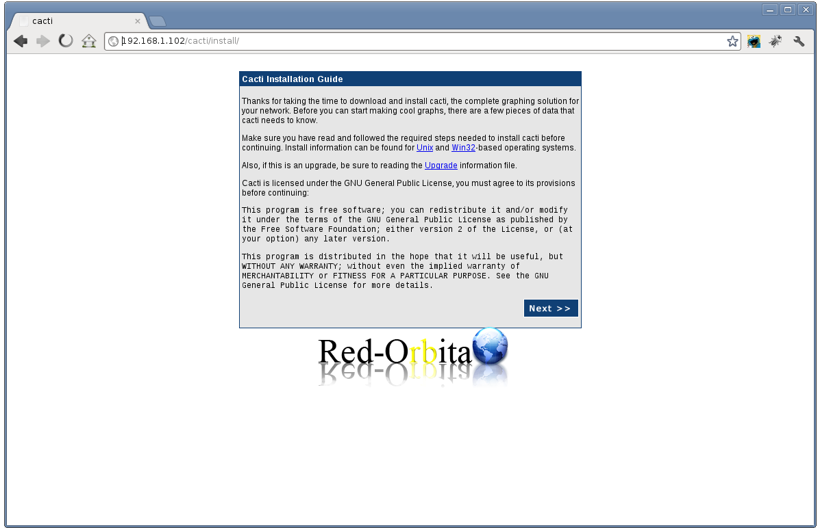 mysql>root@red-orbita:~# wget http://www.cacti.net/downloads/cacti-0.8.8a.tar.gzroot@red-orbita:~# tar xzvf cacti0.8.7.tar.gz -C /var/wwwroot@red-orbita:~# mv /var/www/cacti-0.8.8a/ /var/www/cactiAccedemos a la carpeta