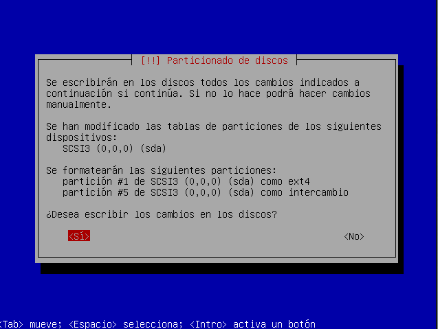 Como podemos ver nos realiza el directamente el particionado del disco. le indicamos que queremos escribir los cambios.