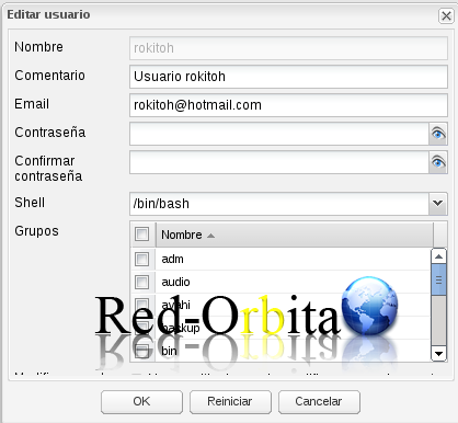 Mediante este panel podremos Administrar nuestros usuarios del sistema, Crear, Editar, Borrar. (Con estos usuarios no podremos administrar la interfaz el servidor por la gráfica)