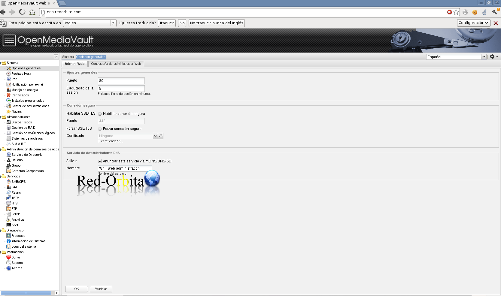 La primera opción que tenemos es: Opciones generales, en el podemos configurar Puerto para acceder a la interfaz web, numero de sesiones y nos da la posibilidad de habilitar la opción de navegación por HTTPS.