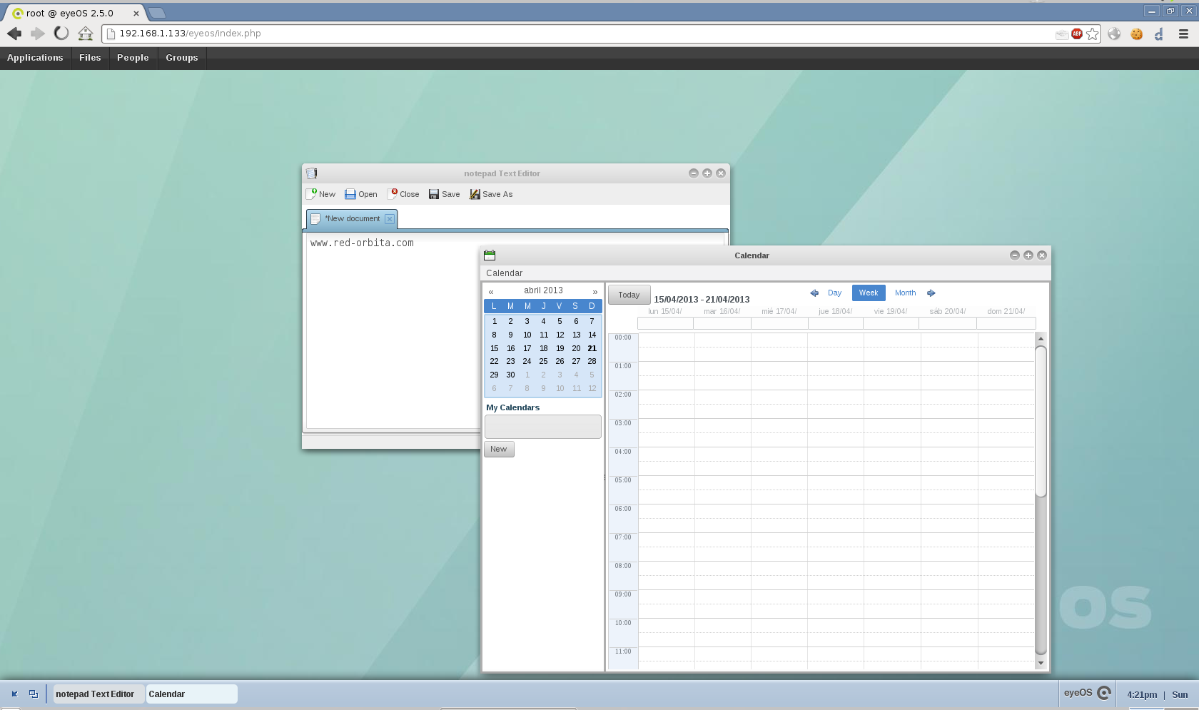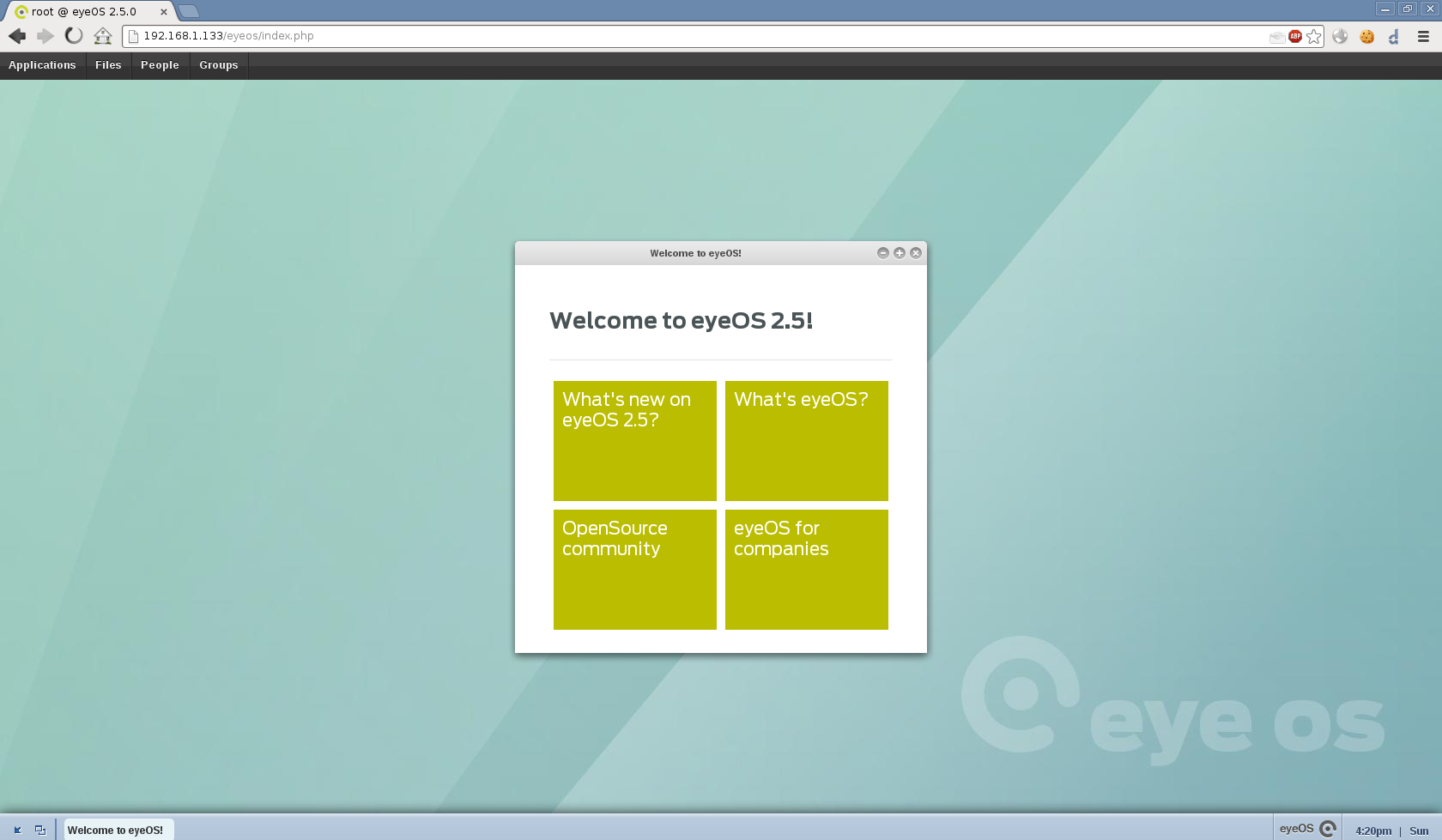 eyeOS es una plataforma de nube privada con una interfaz de escritorio basada en la web. Comúnmente llamado escritorio en la nube por su interfaz única, eyeOS proporciona un escritorio completo desde la nube con gestión de archivos, herramientas de gestión de la información personal, herramientas colaborativas y aplicaciones de la compañía.