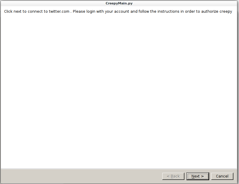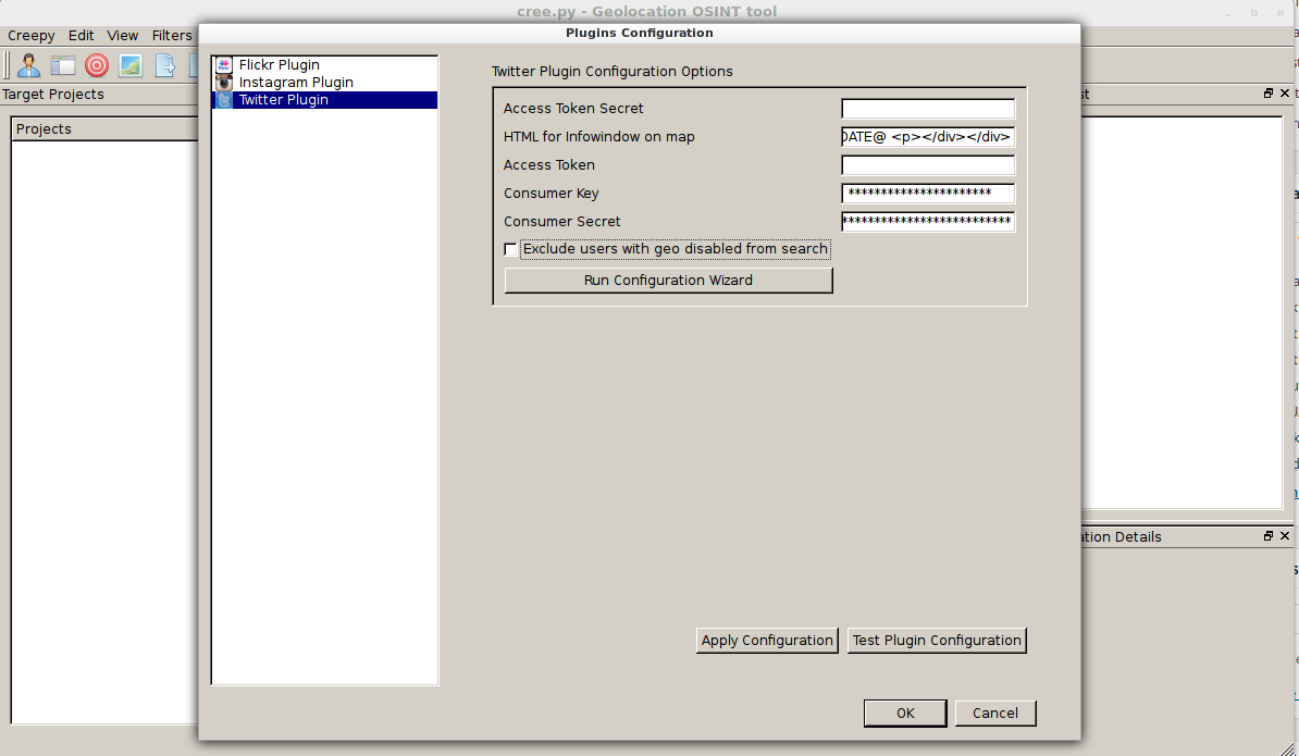 python CreepyMain.pyAntes de realizar una búsqueda tenemos que configurar el software para que pueda extraer los datos, Para ello: Edit > Plugins Configuration