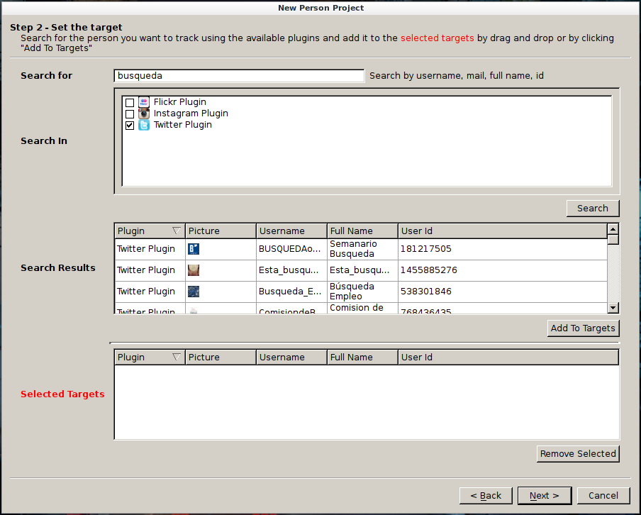 Seleccionamos en que red social queremos hacer la busqueda y añadimos un nombre o identificador del usuario.