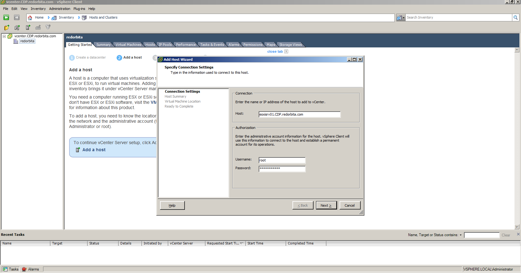 Rellenamos los campos, Nombre de host (Este tiene que estar añadido a nuestro servidor DNS) y usuario y contraseña de nuestro servidor ESXI