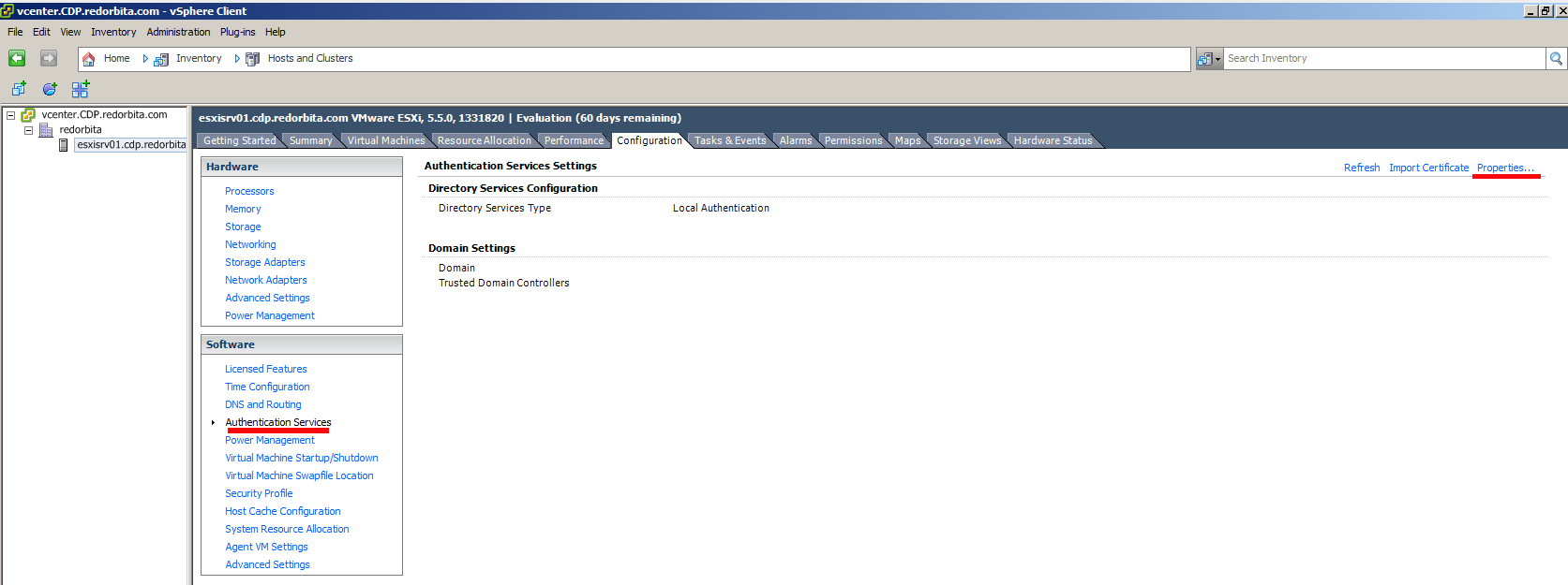 Para ello Accedemos a vSphere Client y nos vamos a: Configuration > DNS and Routing > Properties (Situado en la parte superior derecha)