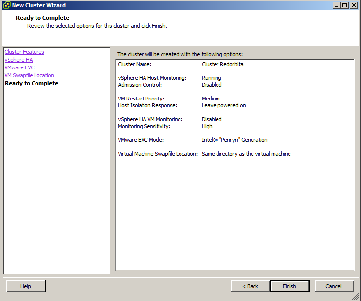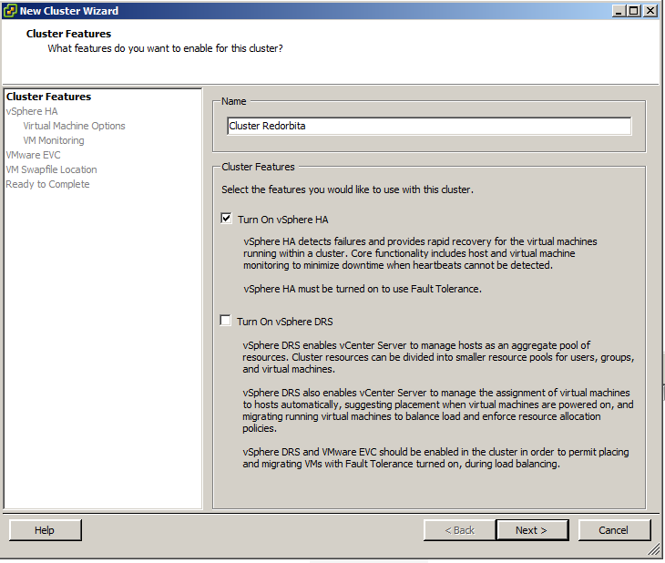 Le asignamos un nombre y habilitamos la opción Turn On vSphere HA
