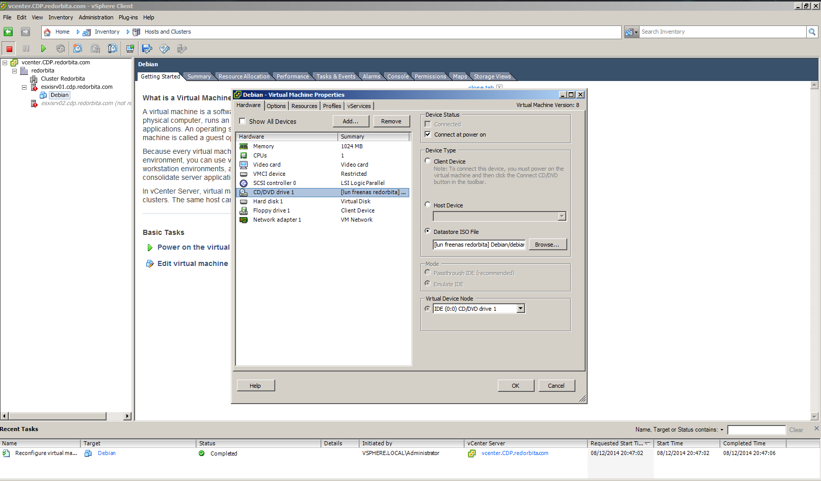 Presionamos botón derecho > Edit virtual machine. y seleccionamos Connect at power on y Datastore ISO file.