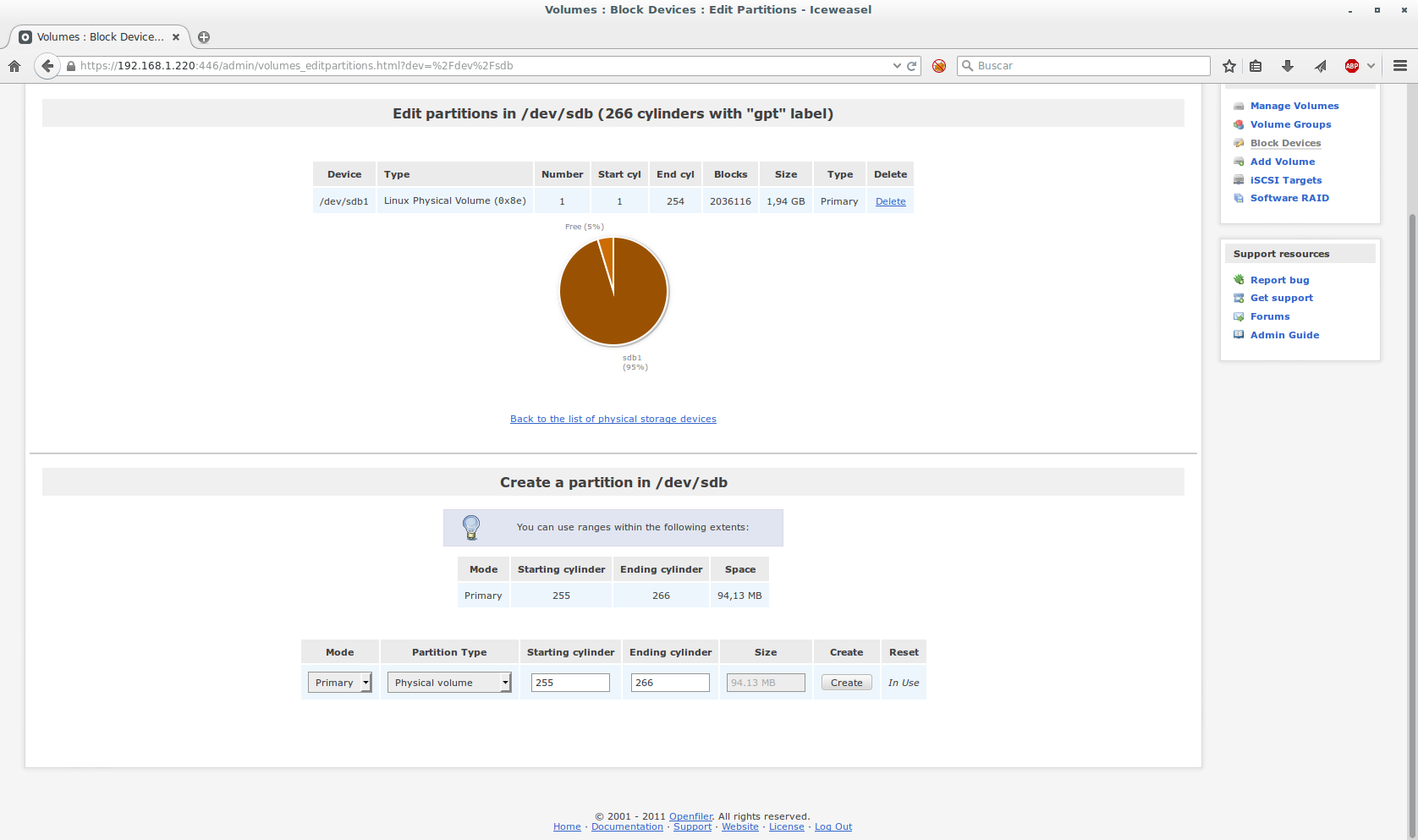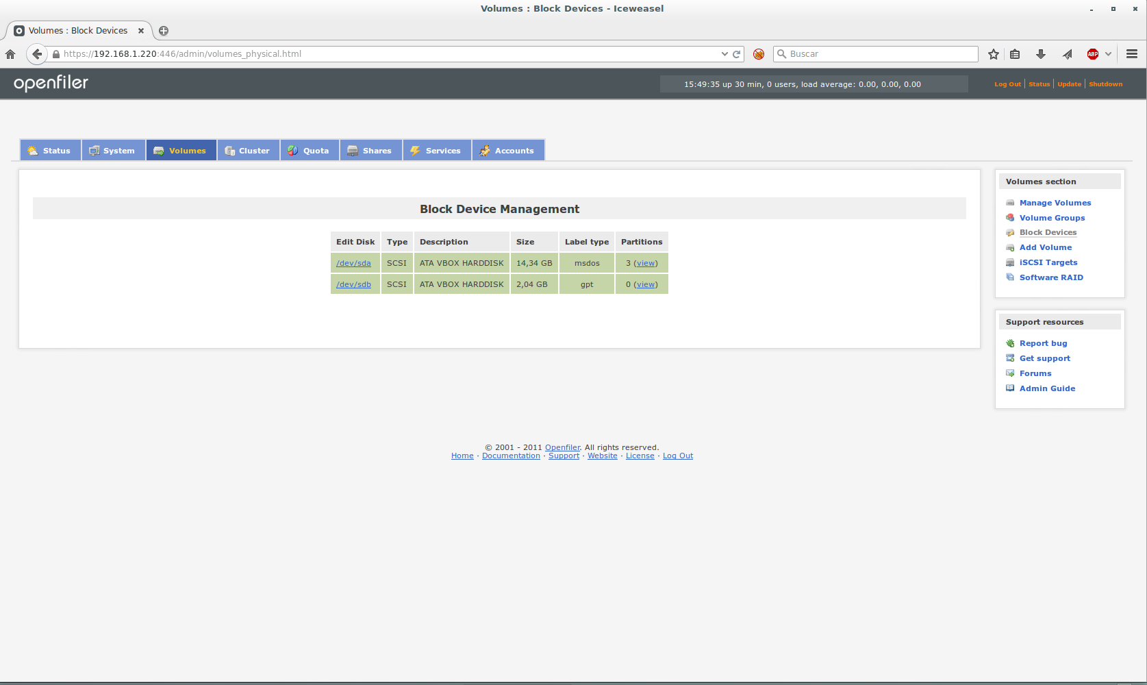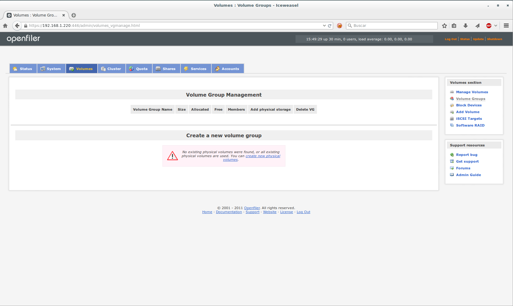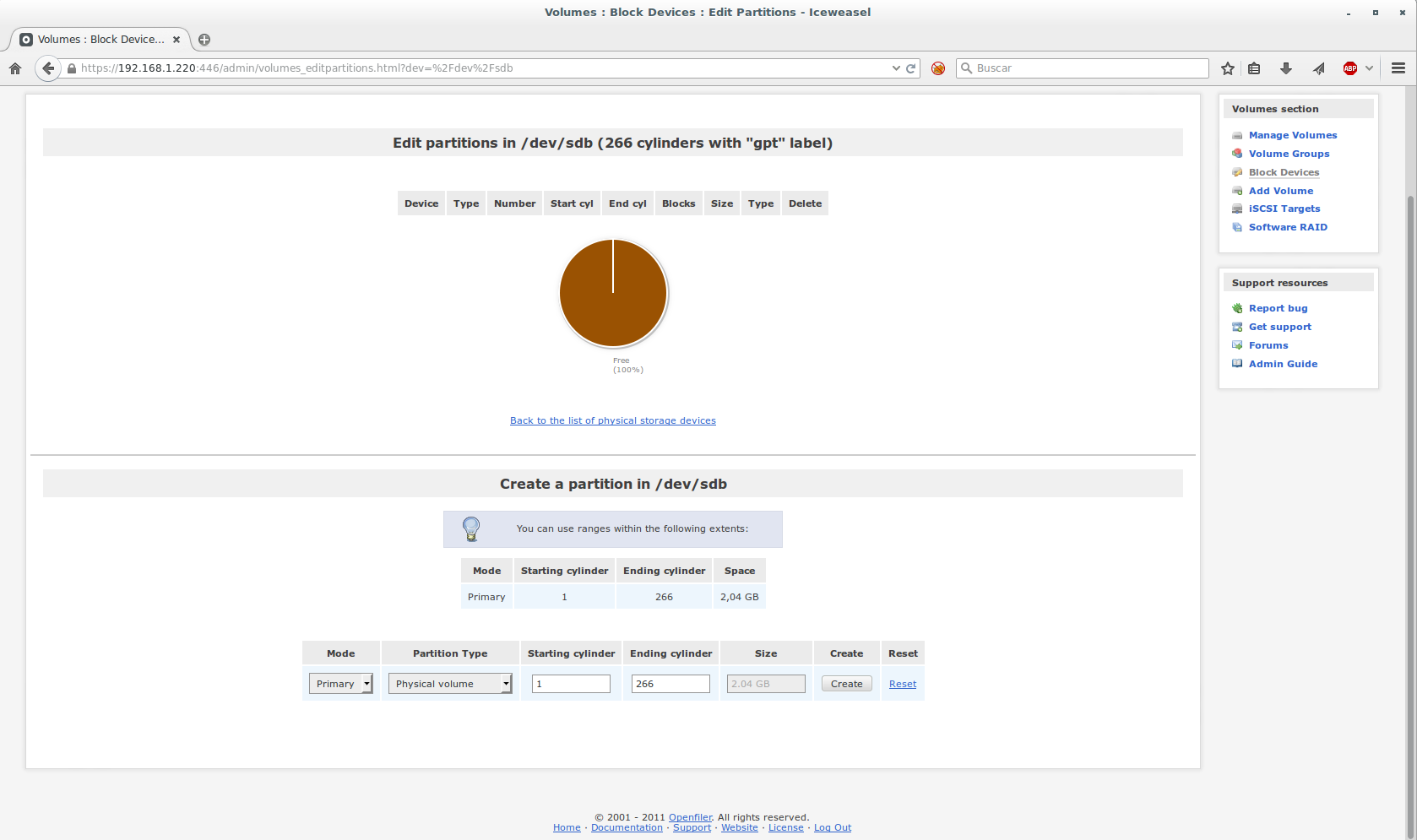 Nos dirigimos a la pestaña Volumes y presionamos en el Hipervinculo Create new physical volumes