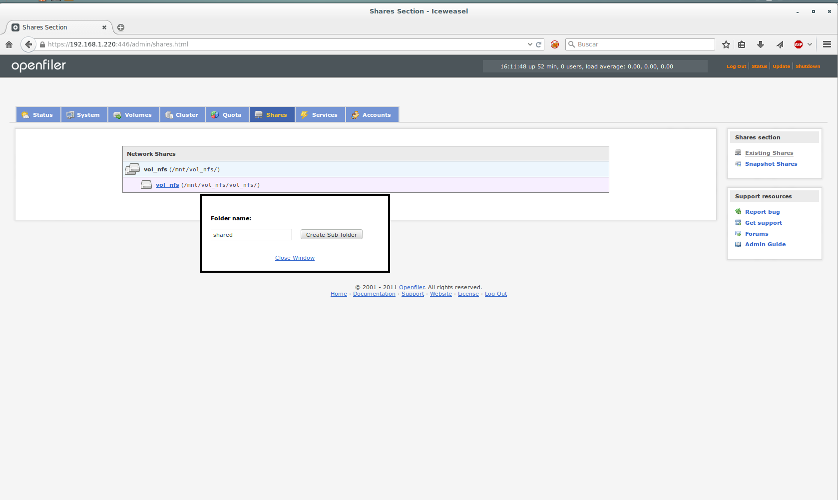 Una vez creado y asignado un grupo al volumen nos dirigimos a la pestaña Shares, en la cual vamos a exportar dicho volumen.