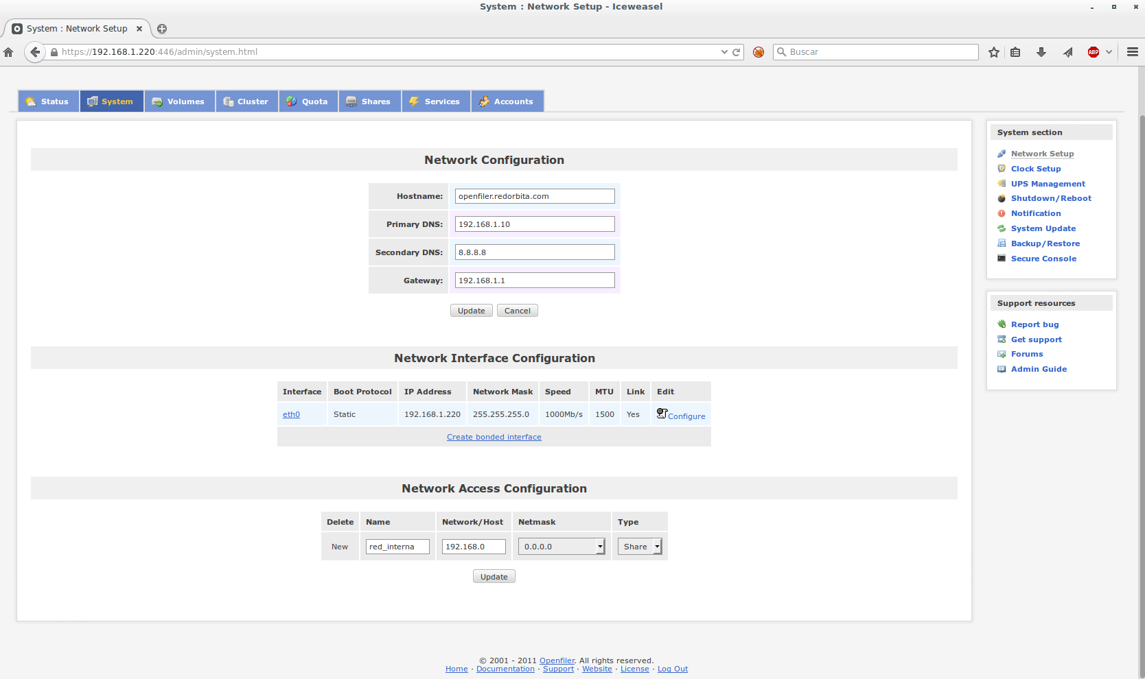 Antes de exportar el volumen creamos una red, para ello nos vamos a la pestaña System y en la parte inferior configuramos la red y mascara a la que le vamos a dar acceso.