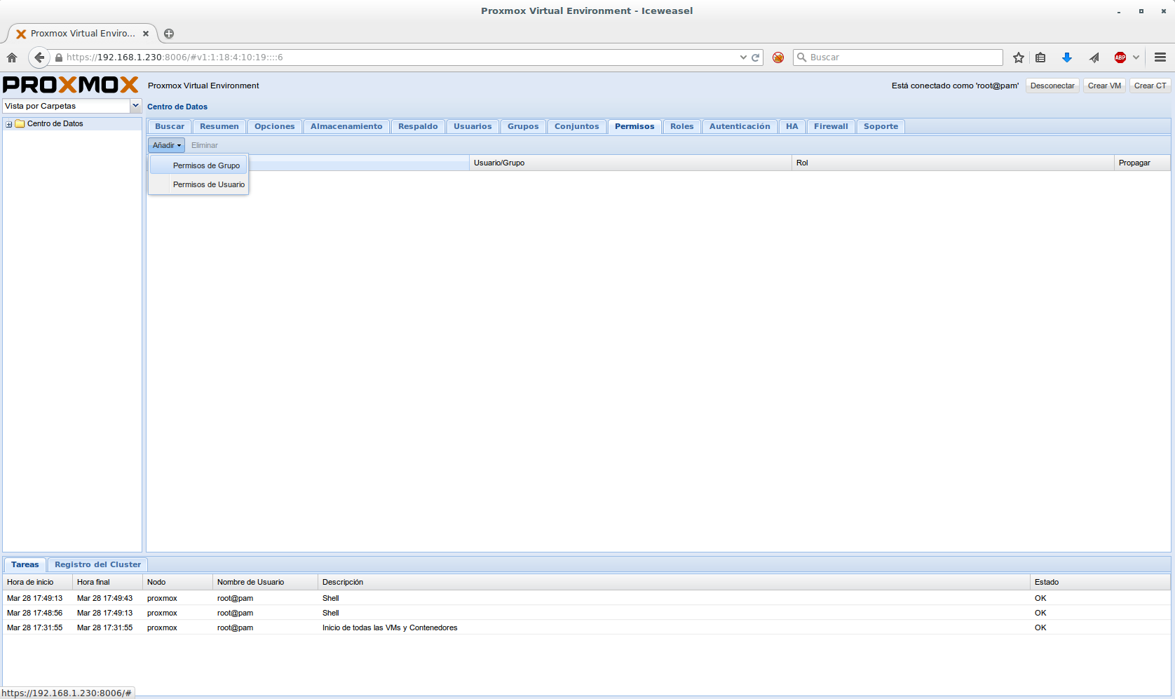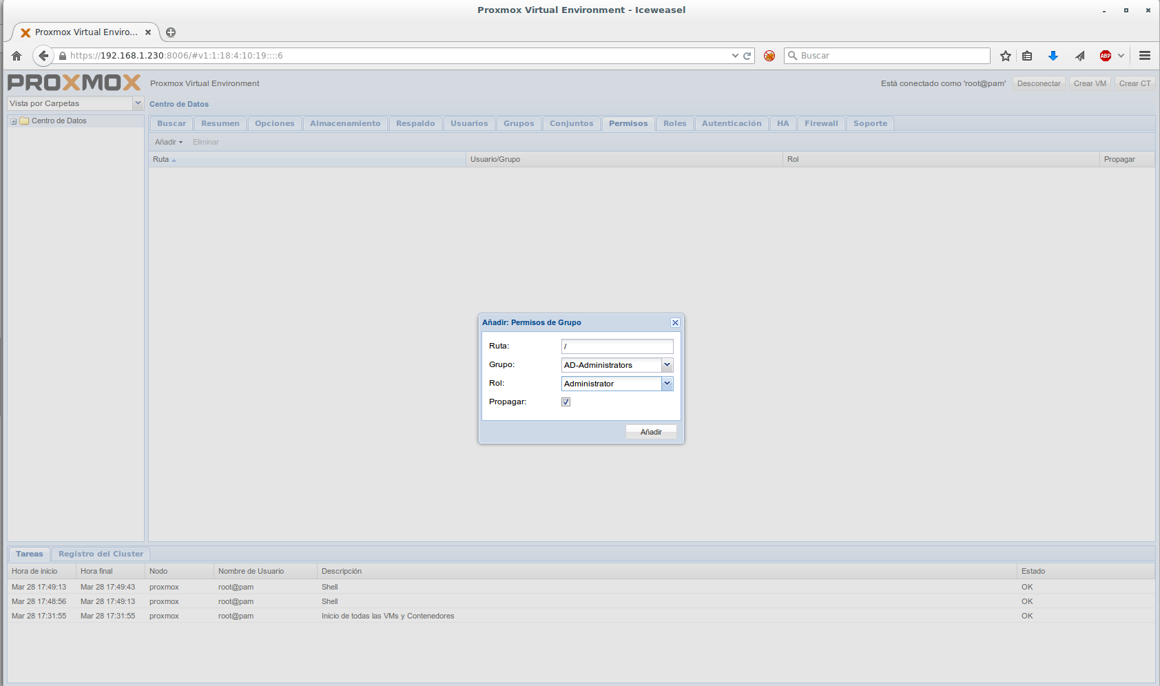 Nos vamos a la pestaña Permisos y otorgamos permiso al grupo creado anteriormente.