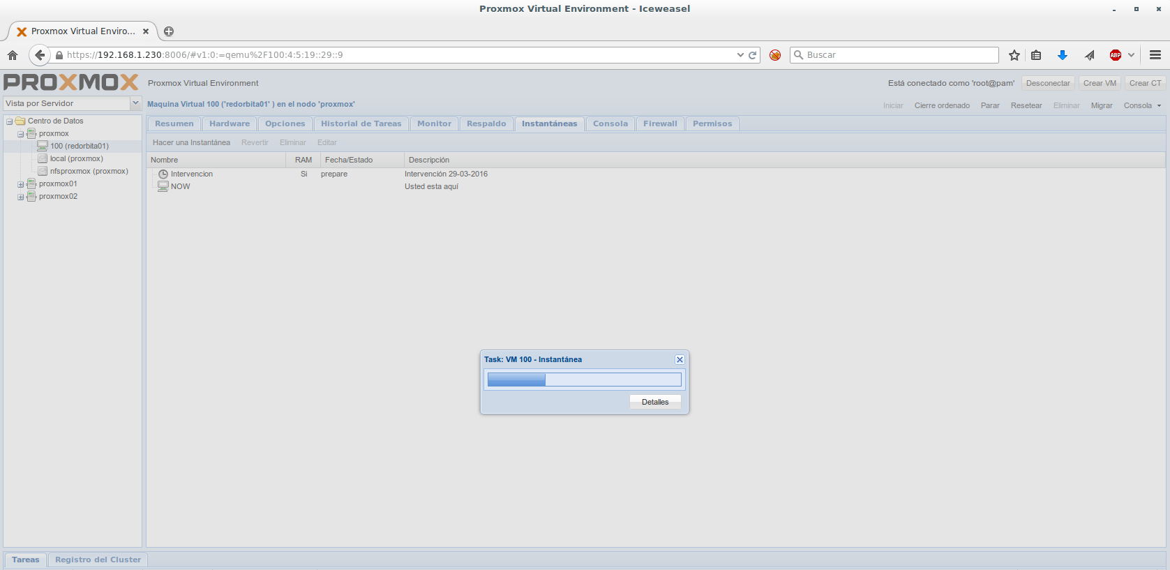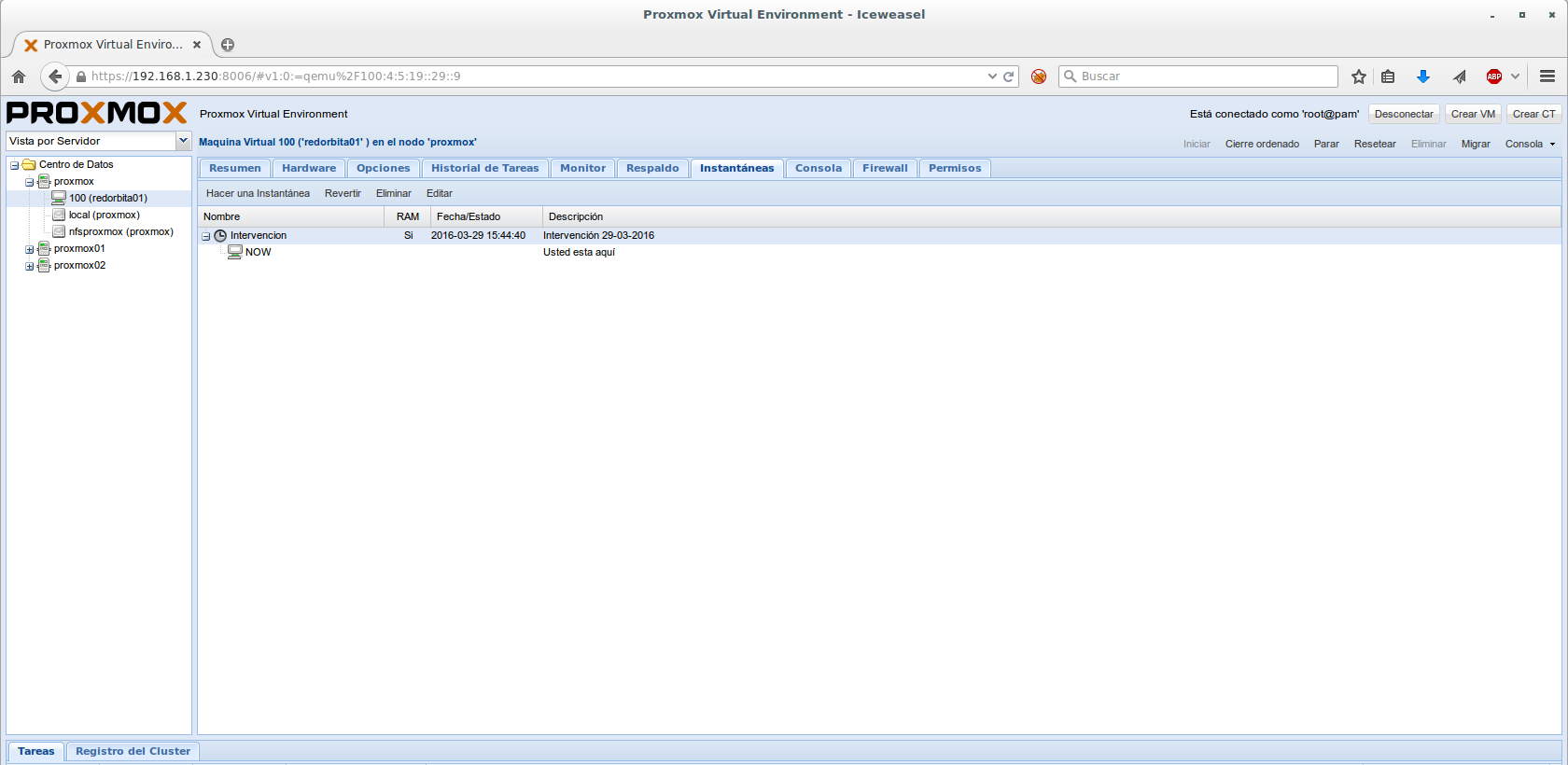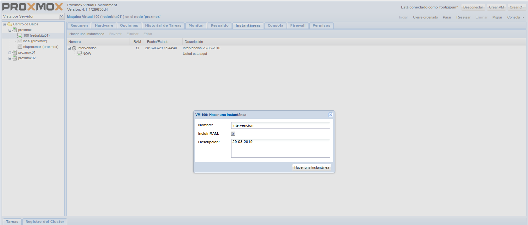 Para realizar un Snapshot (o instantánea ) debemos seleccionar el servidor > Instantáneas > Hacer una instantánea