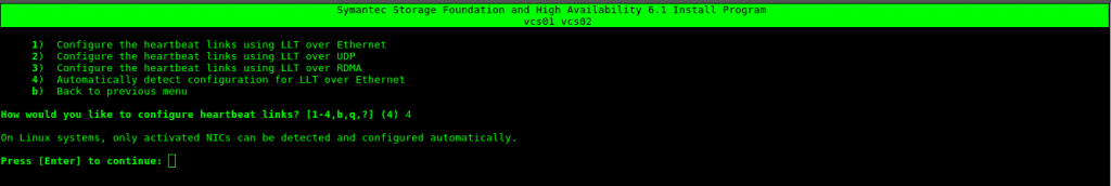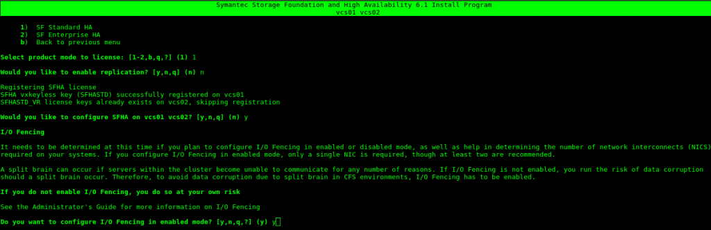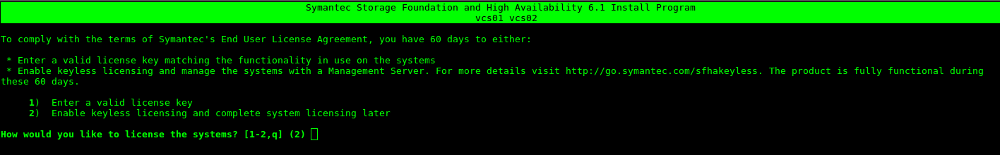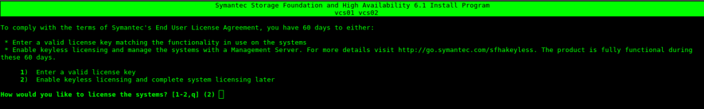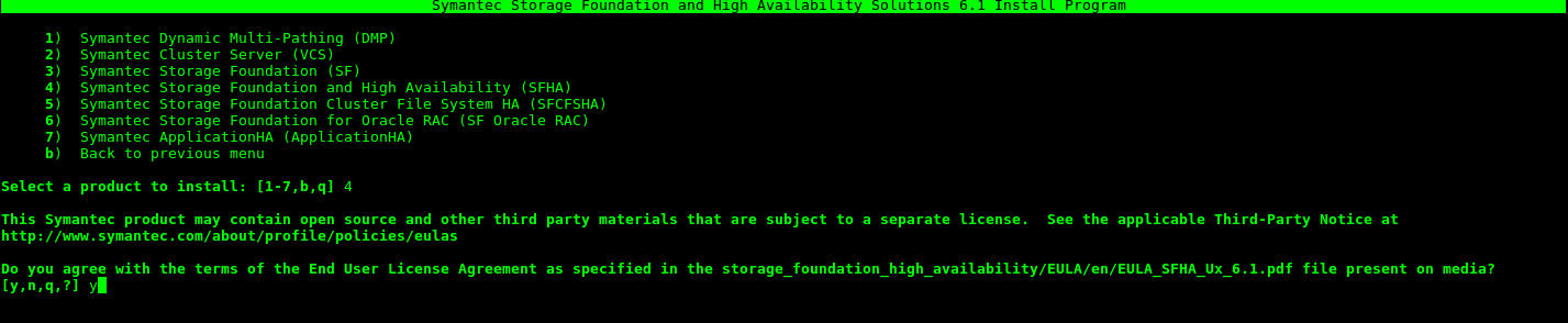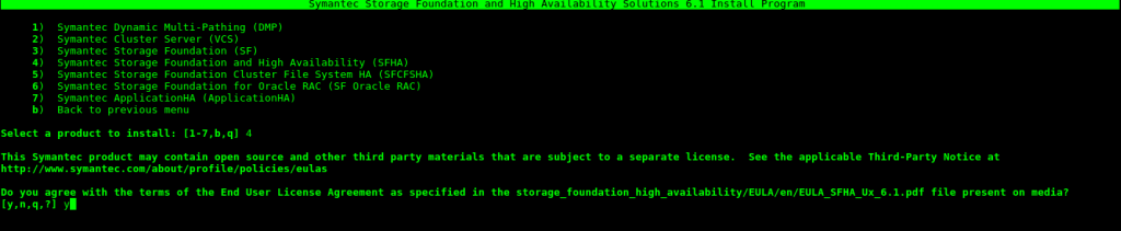 Seleccionamos la opción 4 (Symantec Storage Foundation and High Availability (SFHA) ) y aceptamos los términos de licencia.