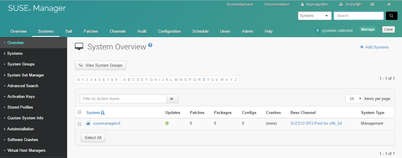 Una vez se haya instalado accedemos al panel de Suse manager : Systems