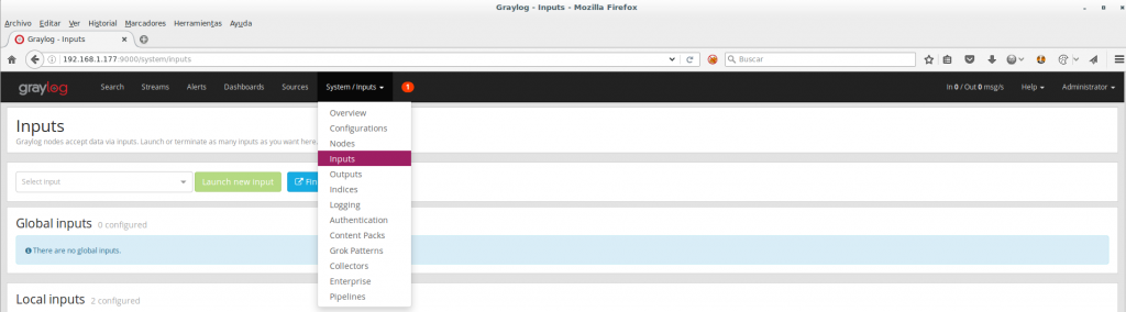 service rsyslog restartMediante nuestro navegador web nos vamos a la consola de graylog > System > Inputs