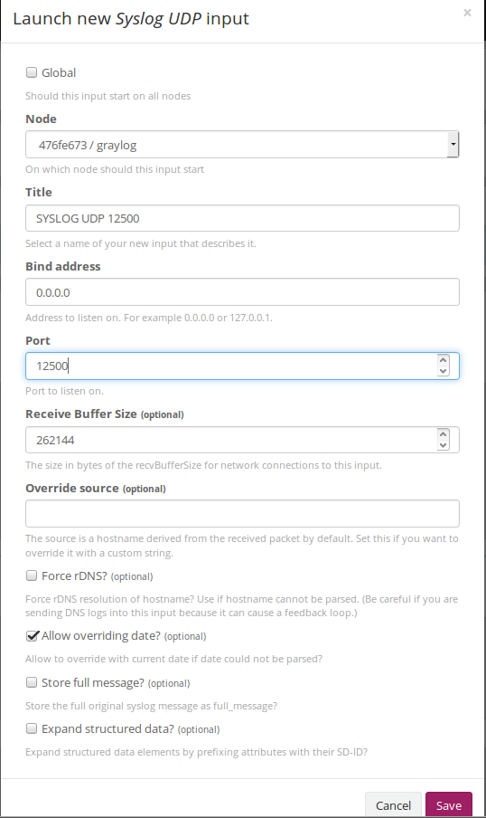 Se nos abrirá un asistente de configuración, en el solo debemos añadirle un titulo y el puerto el cual hemos configurado anteriormente en RSYSLOG , que en nuestro caso es: 12500
