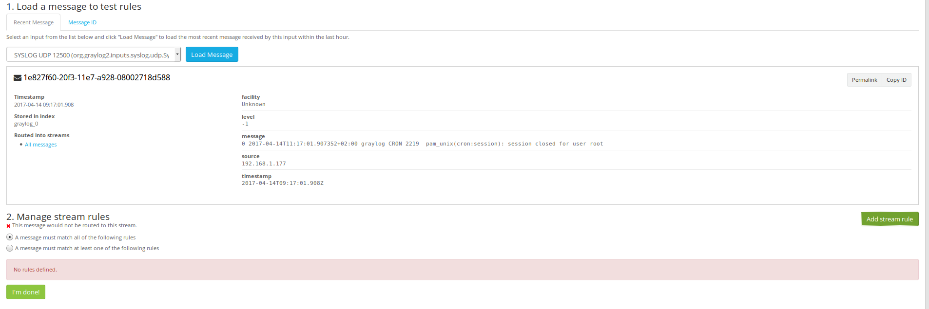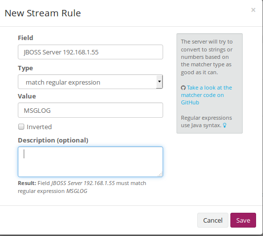 Seleccionamos el servidor que queremos agregarle el Streams > Load Message > Add Stream rule