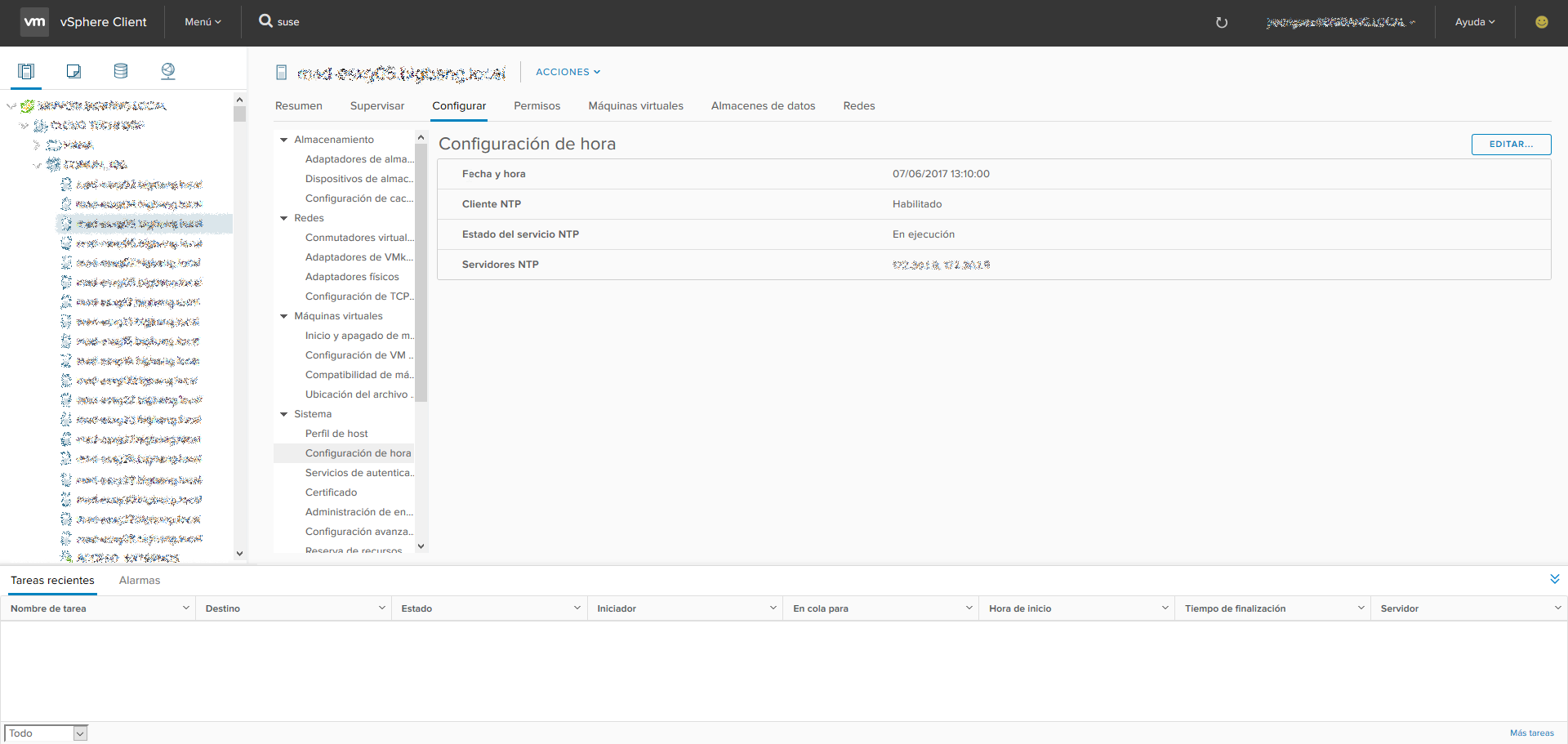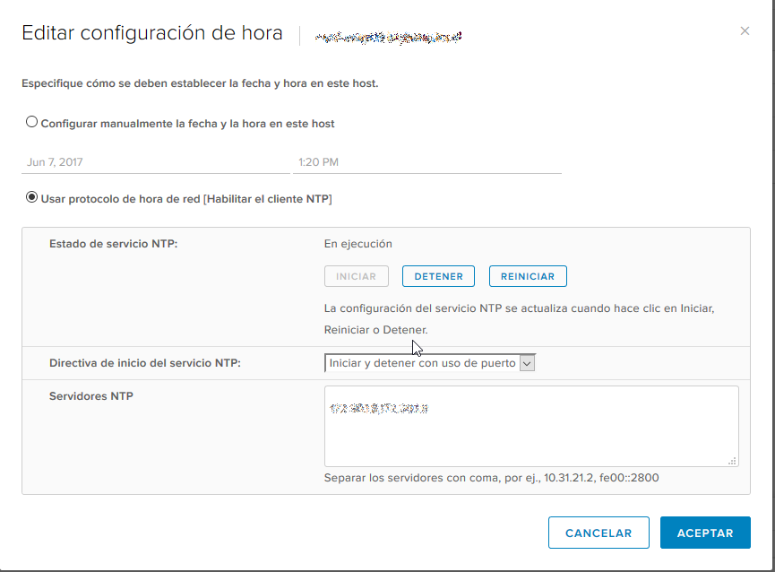 Para la configuración/modificación de NTP en un servidor ESXi es muy fácil, simplemente presionamos sobre el servidor el cual queremos modificar > configurar > configuración de hora