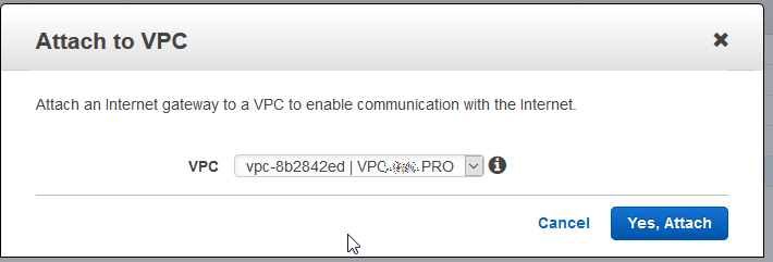 Asociamos el Internet Gateway con la VPC creada anteriormente. Para ello seleccionamos la Inetnet Gateway creada y presionamos sobre Attach to VPC