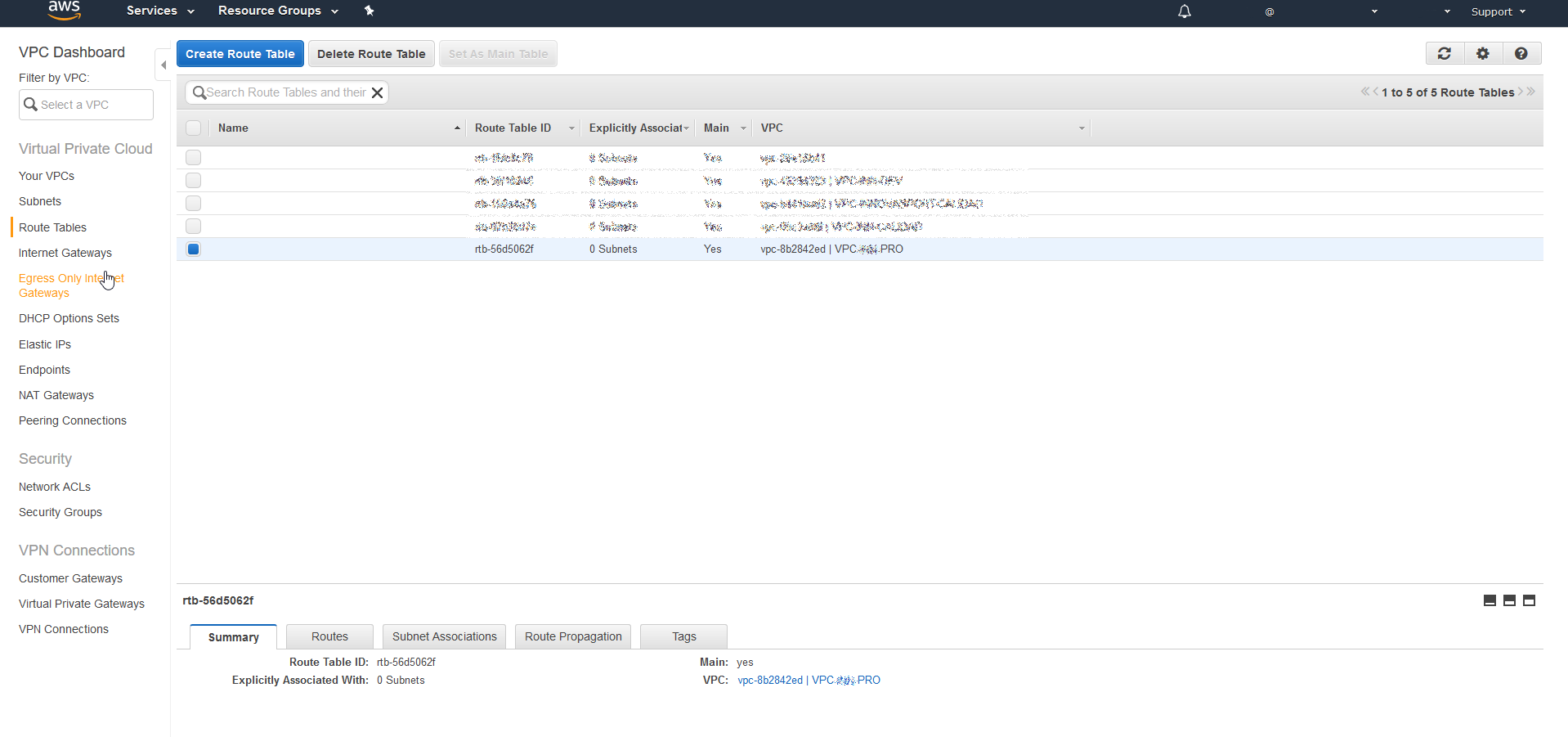 Después debemos crear una ruta y asociarlo a la VPC, para ello seleccionamos en el menú de la izquierda Route Tables