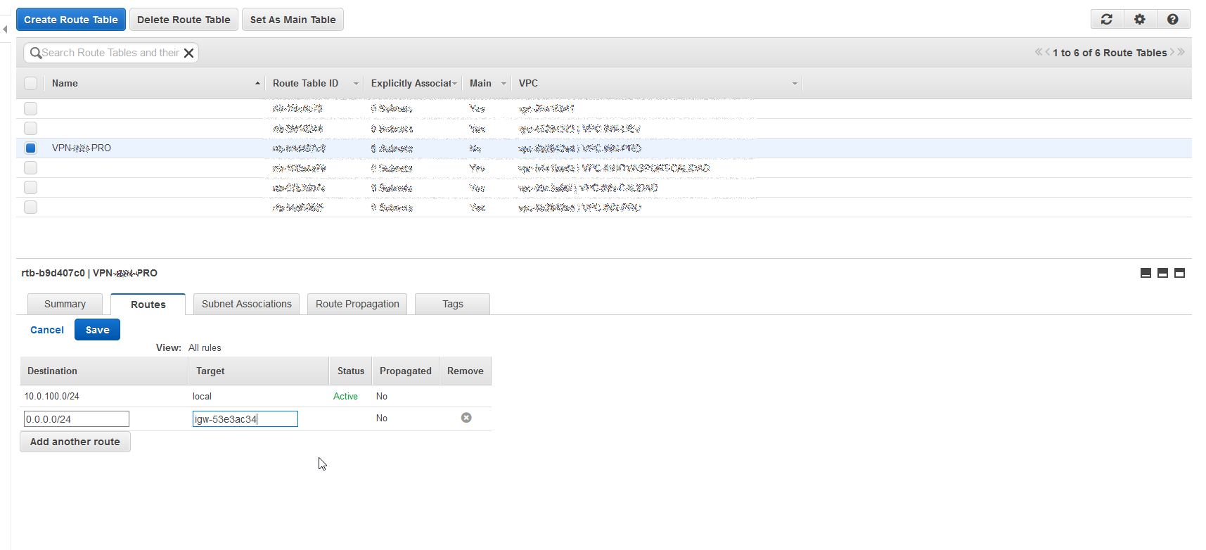 Una vez creada el Route Table tenemos que añadir las rutas necesarias para otorgar conectividad entre los servidores o la salida a internet si es que tuviese que tenerla.