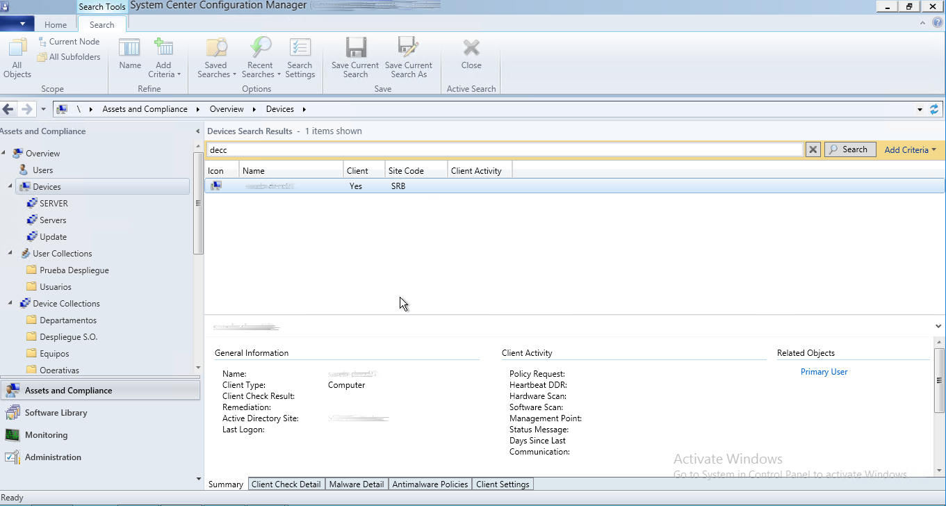 Assets And compliace > Devices y buscamos el servidor que hemos añadido, debemos comprobar que en client pone YES