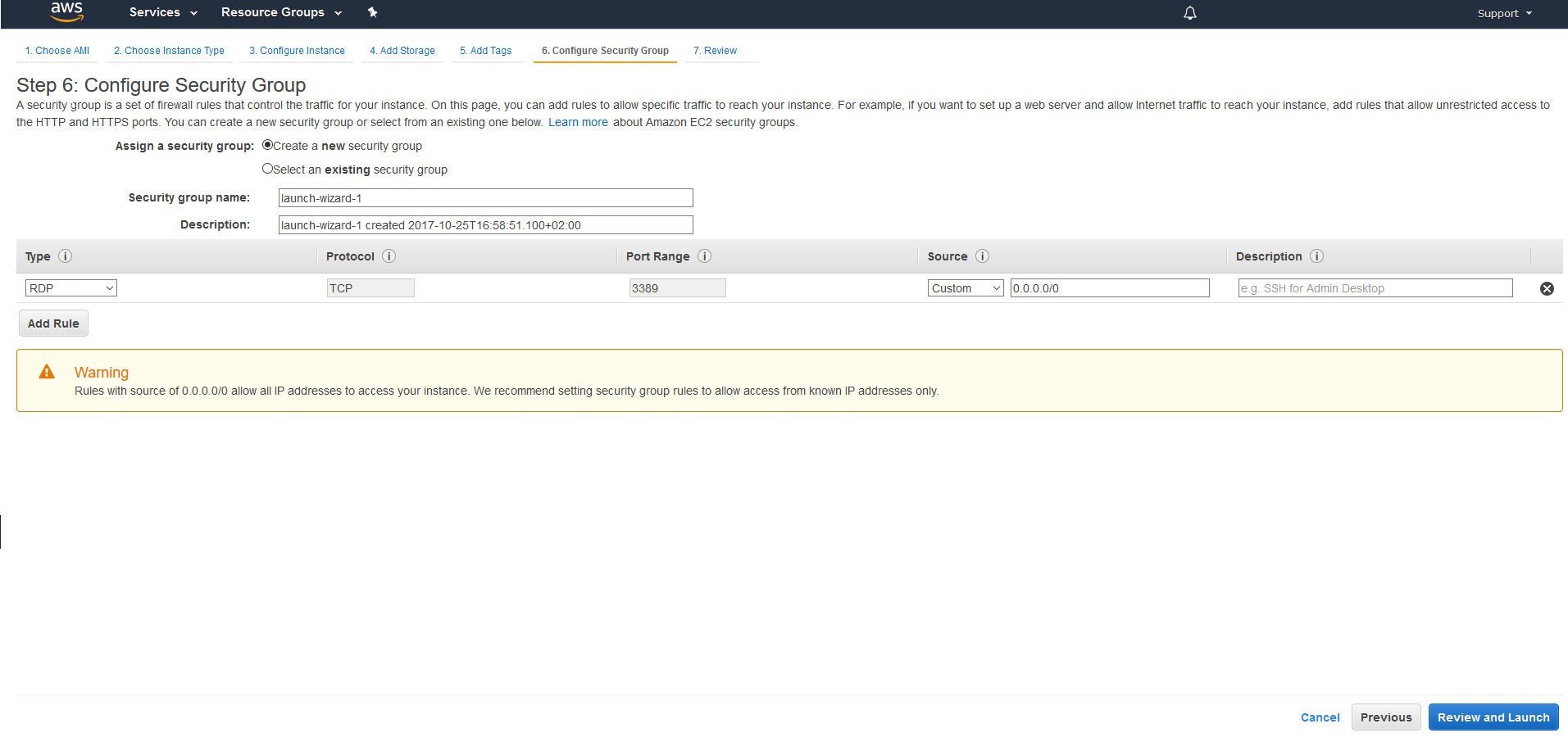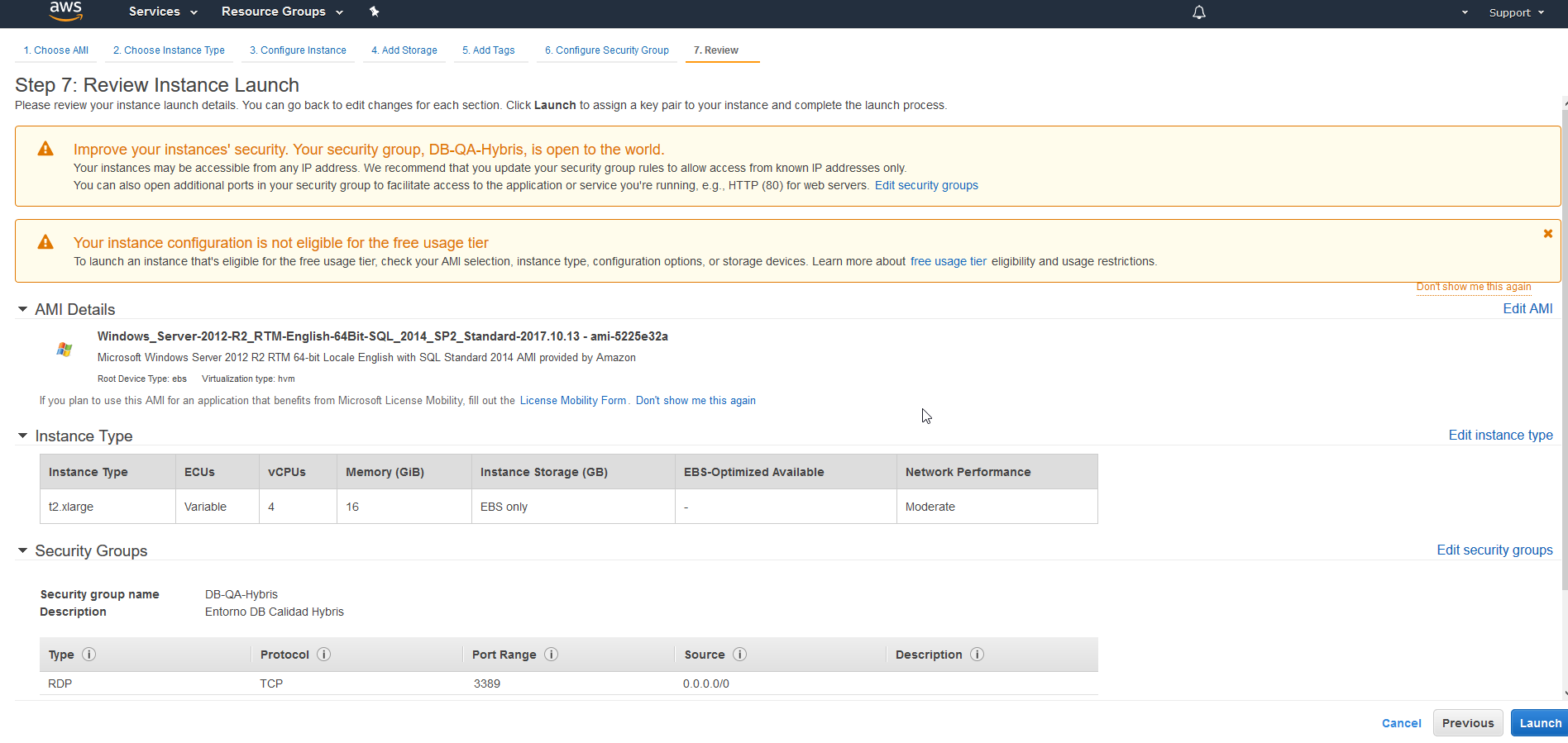 En este caso dado que solo es una prueba de concepto no he configurado el security group, lo he dejado por defecto, en próximas entradas veremos como realizar una correcta configuración.