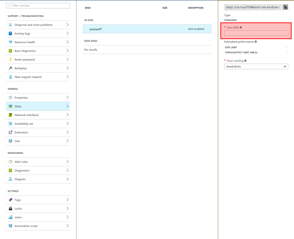 Dentro del portal de azure nos vamos a: Settings > Disks > Seleccionamos nuestra maquina virtual > seleccionamos el OS disk > cambiamos el tamaño del disco.