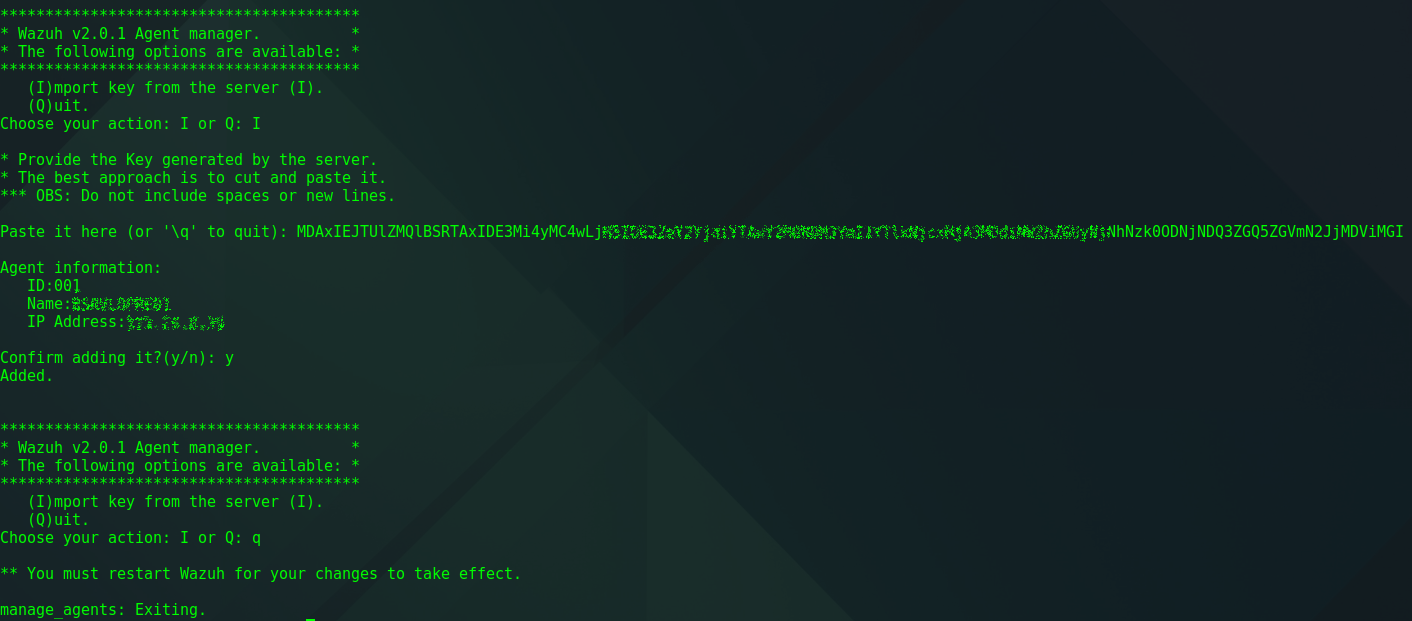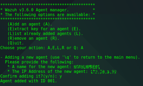 Tras instalar el agente debemos ir al servidor de wazuh y ejecutar /var/ossec/bi/manager_agents, seleccionar la opción A y complementar la información que nos pide.
