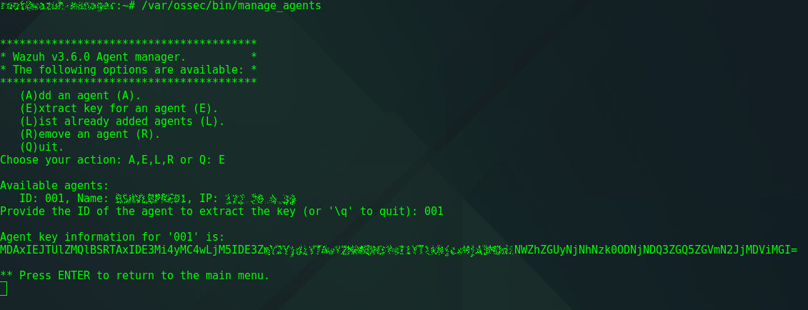 Tras agregar el agente debemos sacar la key asociada a ese agente, para ello volvemos a ejecutar: /var/ossec/bin/manage_agents y seleccionamos la opción E