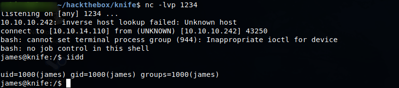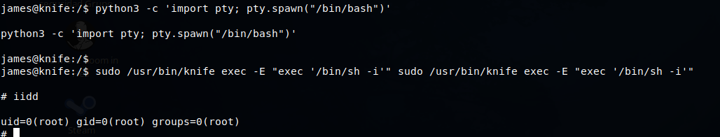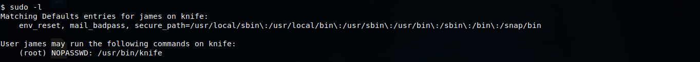 Empezamos a enumerar y lo primero que detectamos es que el usuario james tiene permisos mediante SUDO para ejecutar sin contraseña el comando ‘knife’