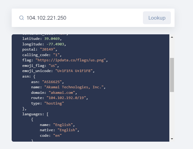 "sourceIPAddress": "104.102.221.250"Comprobamos mediante https://ipdata.co/ que la dirección ip 34.234.236.212 pertenece a Amazon y 104.102.221.25 a Akamai