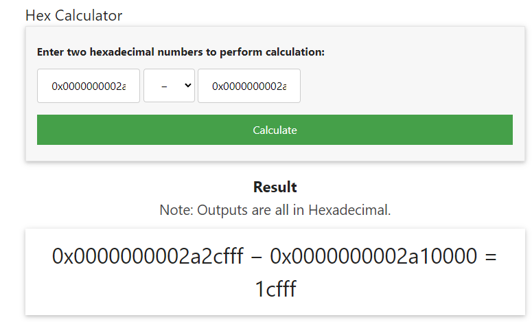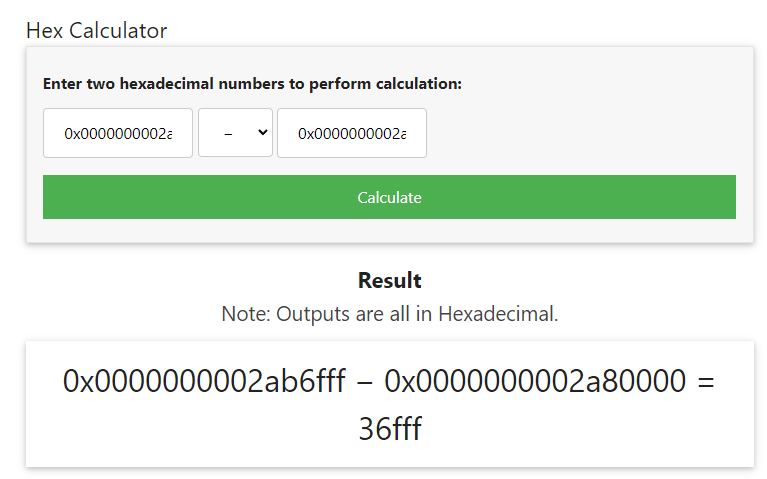 Tenemos que calcular el VAD de los dos para ver cual es el mayor (End – Start). Para hacer el calculo yo me he ayudado con https://miniwebtool.com/hex-calculator.