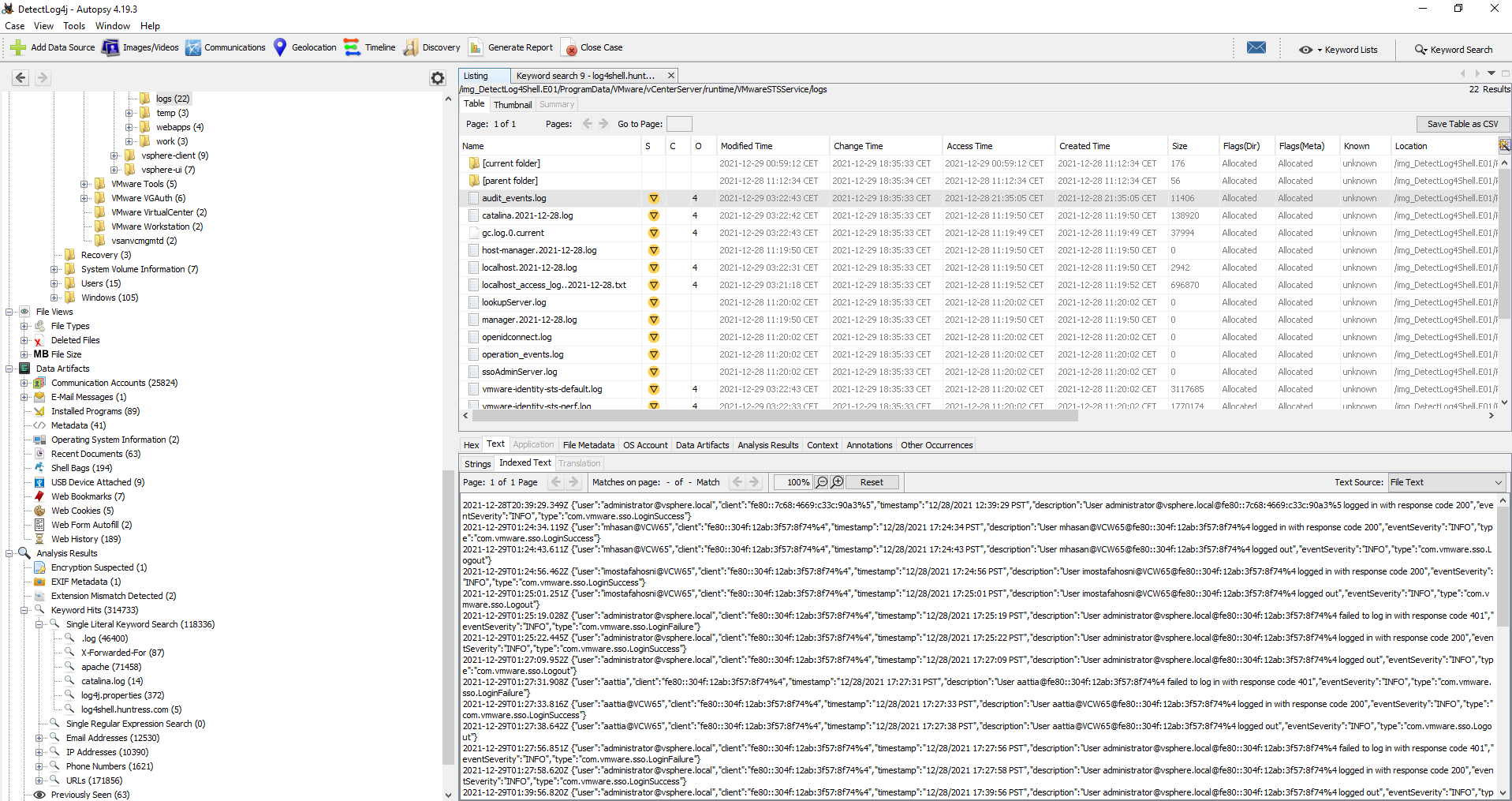 De la misma forma, si queremos podemos ir a la ubicación del archivo el cual se encuentra en: Detectlog4shell.E01_1 Host > Detectlog4shell.E01_1 > ProgramData > VMware > vCenterServer > runtime > VMwareSTSService > logs > audit_events.log