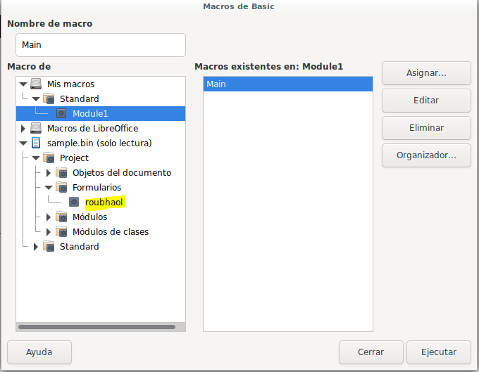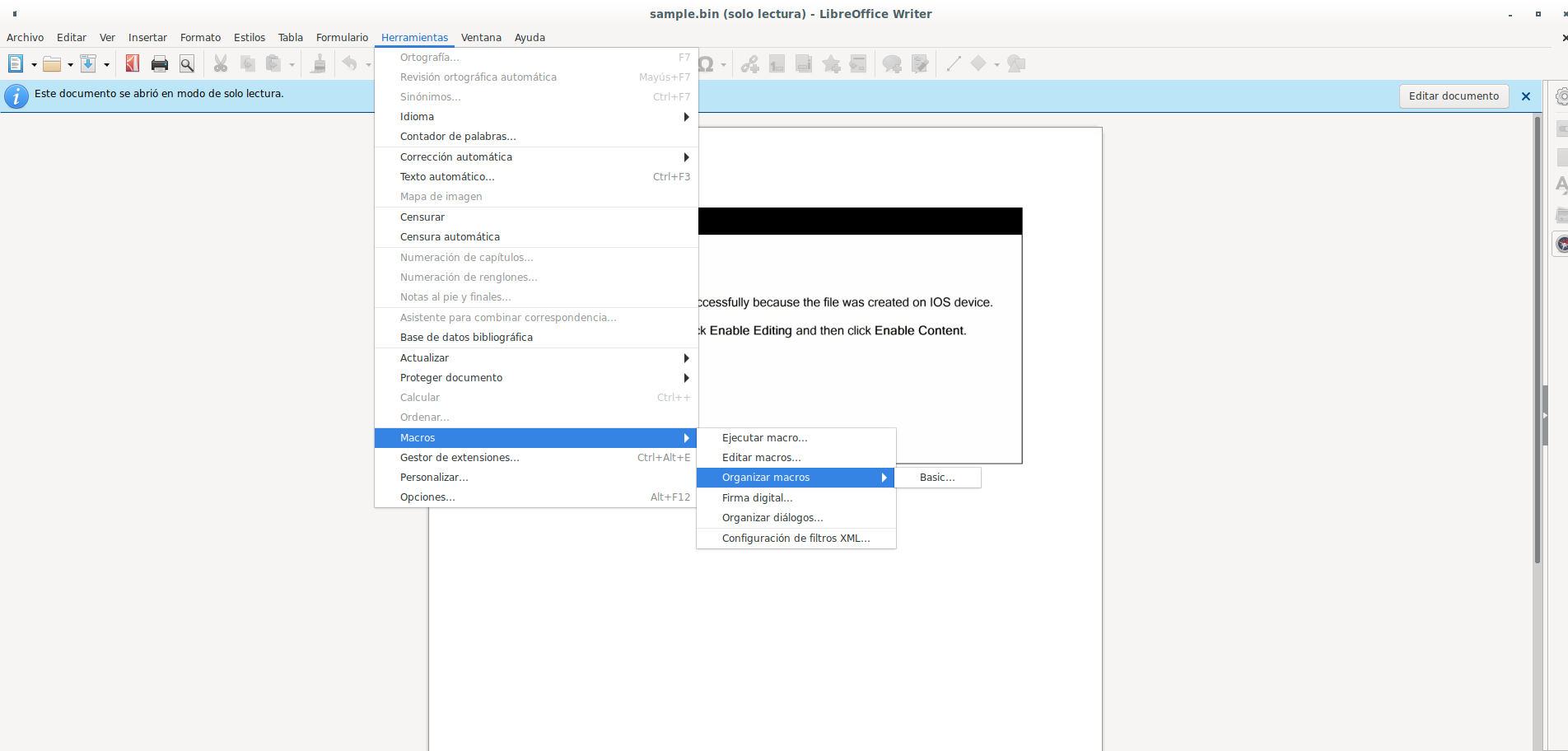 Abrimos el archivo mediante LibreOffice Write > Tools > Macros > Macro Organization > Basic