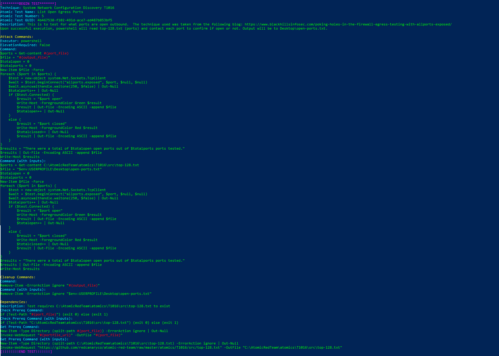 Description: This is to test for what ports are open outbound. The technique used was taken from the following blog: https://www.blackhillsinfosec.com/poking-holes-in-the-firewall-egress-testing-with-allports-exposed/ Upon successful execution, powershell will read top-128.txt (ports) and contact each port to confirm if open or not. Output will be to Desktop\open-ports.txt.