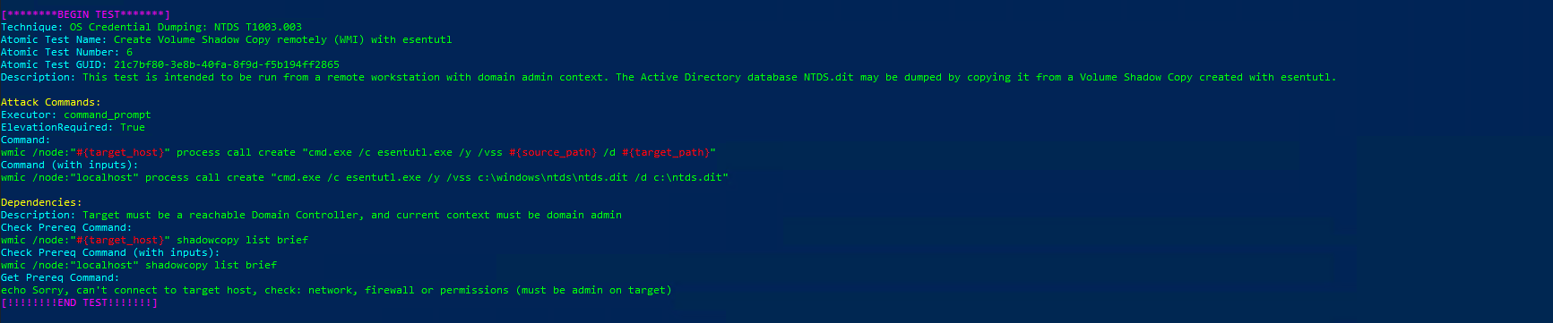 Description: This test is intended to be run from a remote workstation with domain admin context. The Active Directory database NTDS.dit may be dumped by copying it from a Volume Shadow Copy created with esentutl.