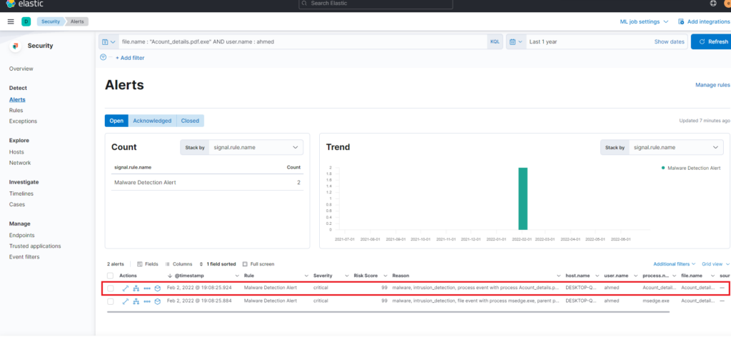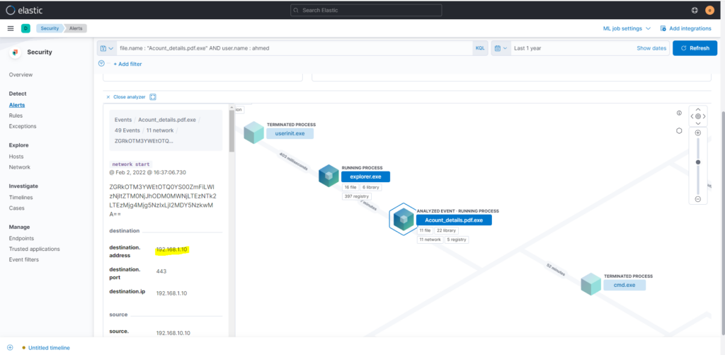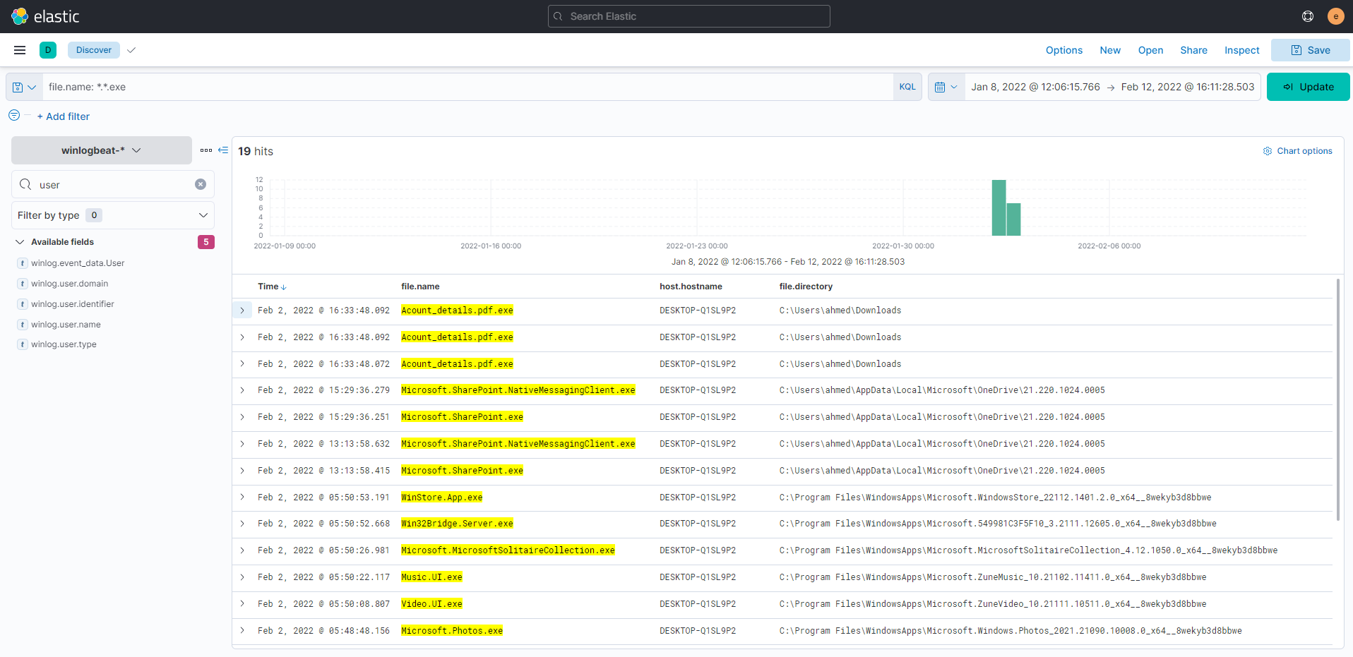 Filtramos la doble extensión mediante file.name: *.*.exe y podemos ver como el usuario ahmed se a descargado un archivo llamado Acount_details.pdf.exe