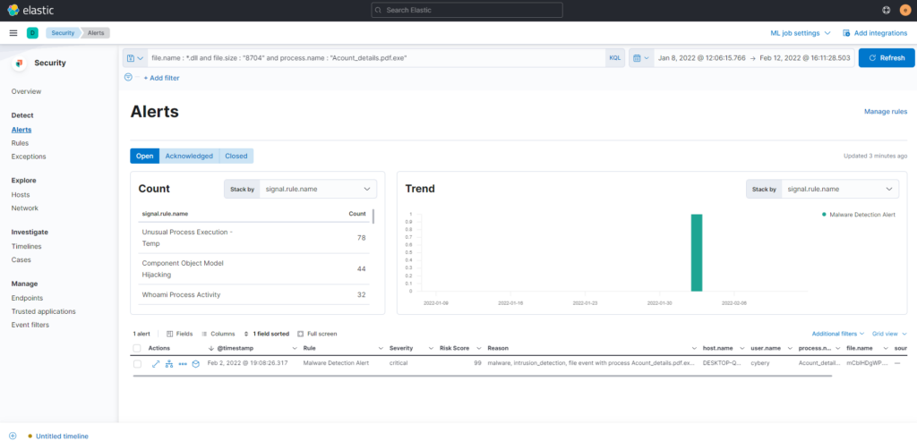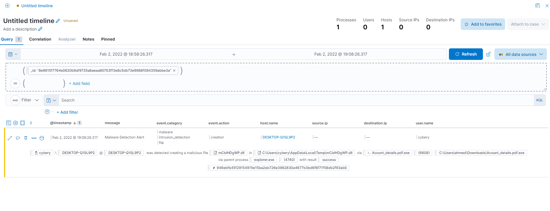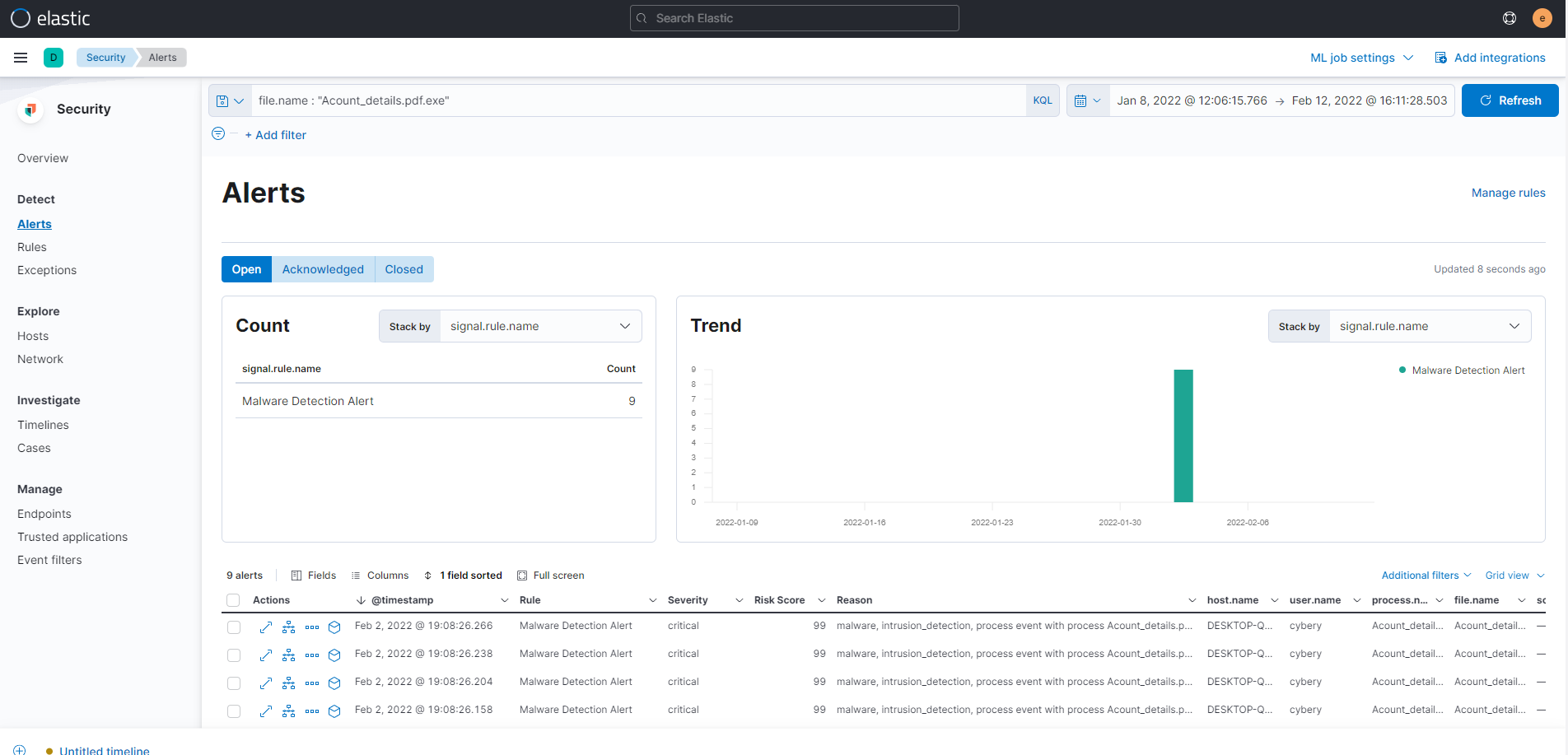 Como en la anterior pregunta nos vamos a en Security > Alerts y buscamos file.name : «Acount_details.pdf.exe». Como podemos observar en la imagen el usuario cybery tambien a ejecutado el archivo.