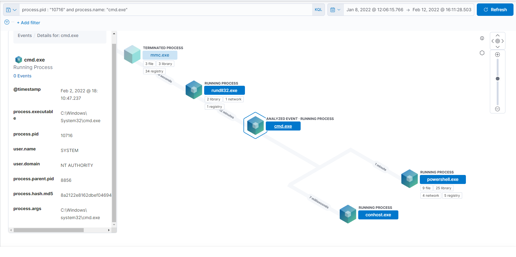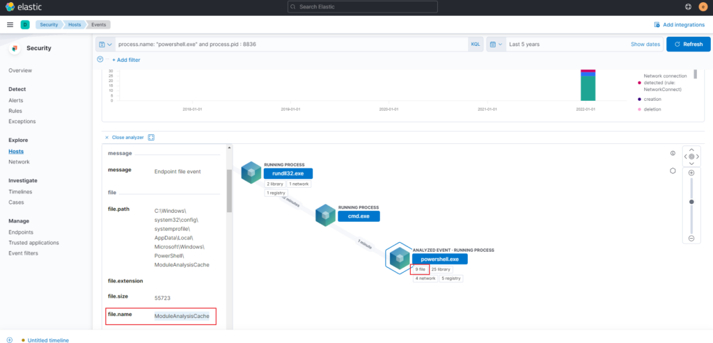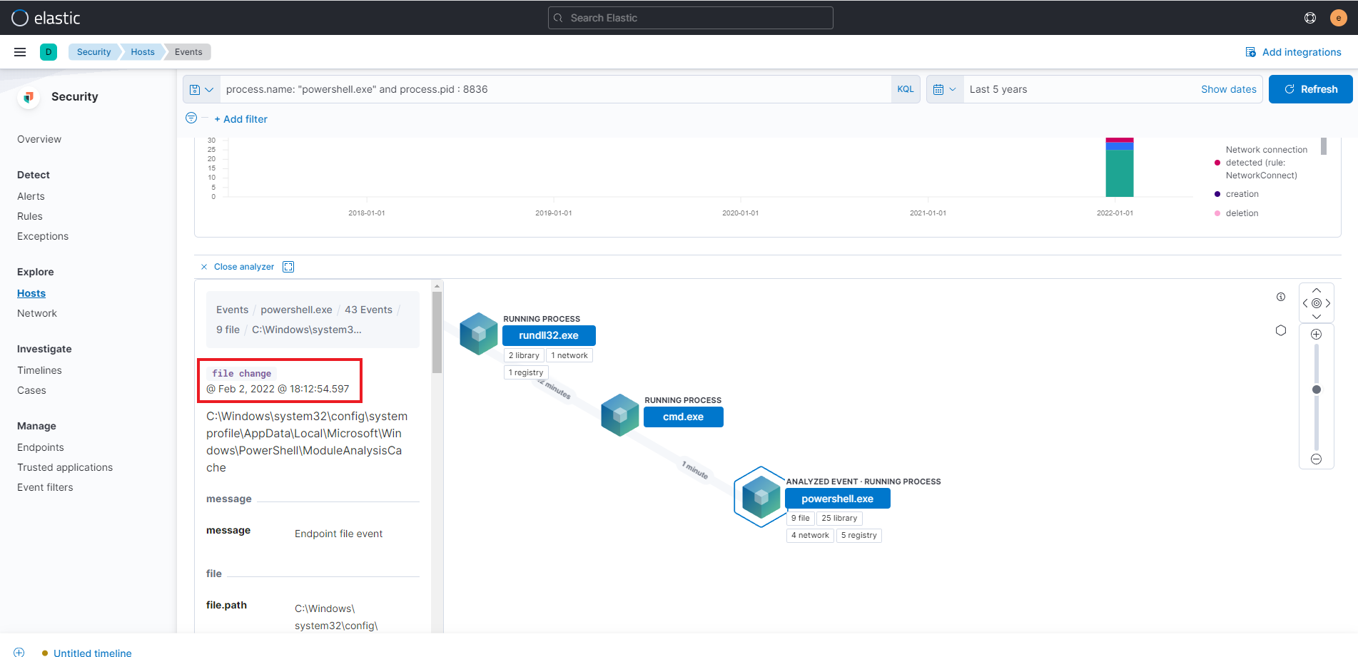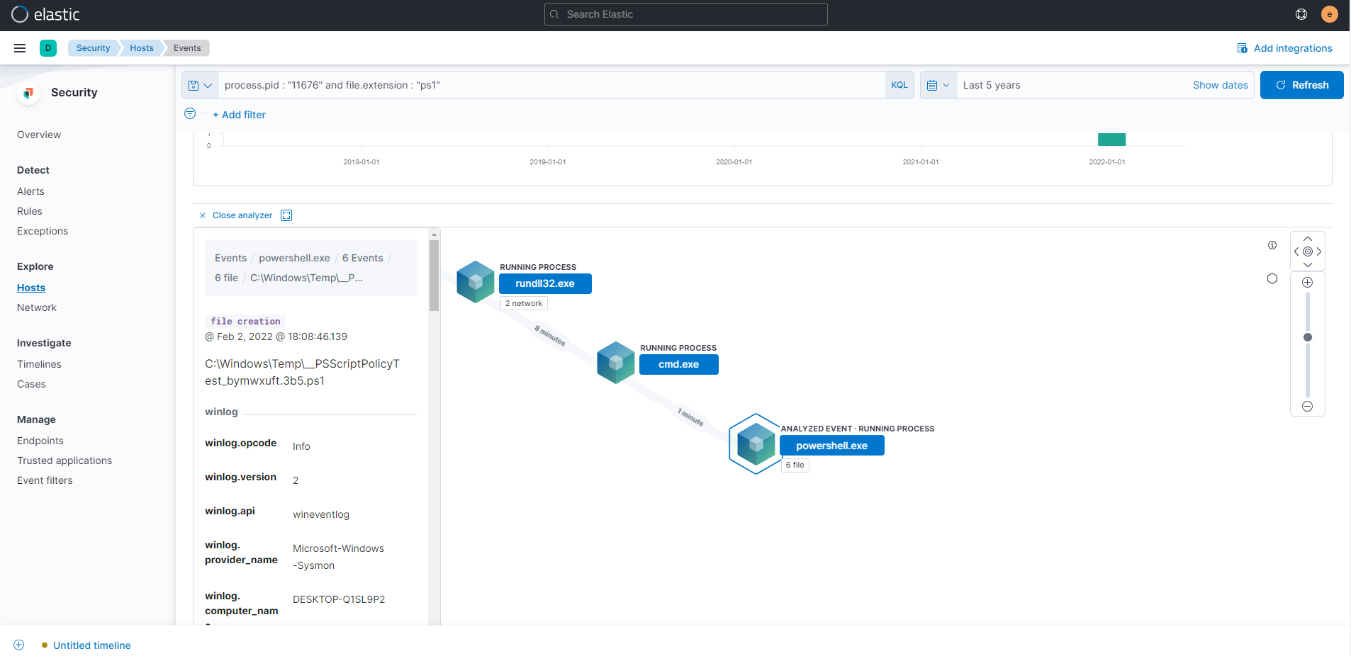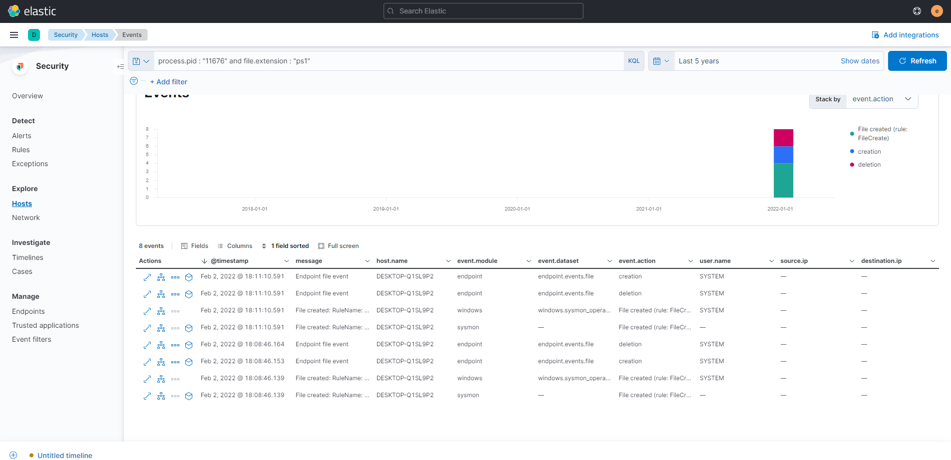 Nos vamos a Security > Hosts > Events y filtramos por el PID y la extensión indicada.
