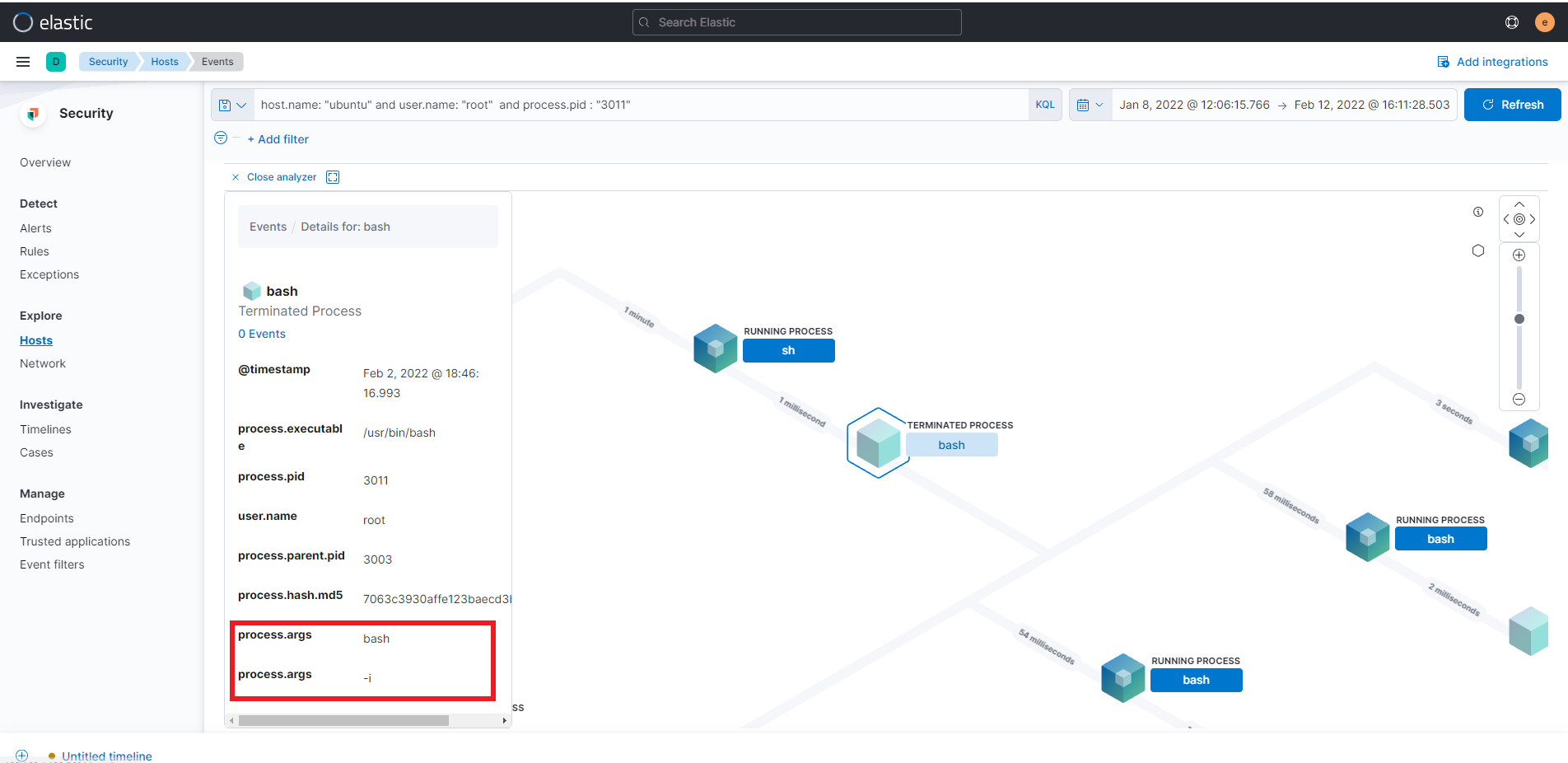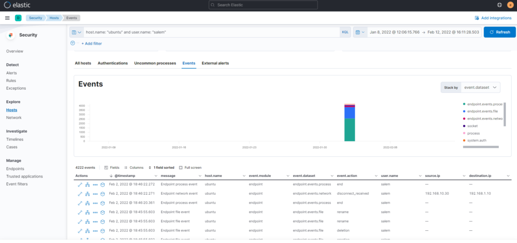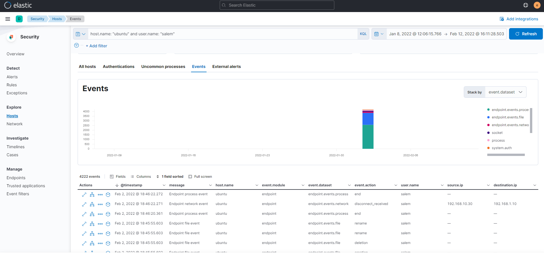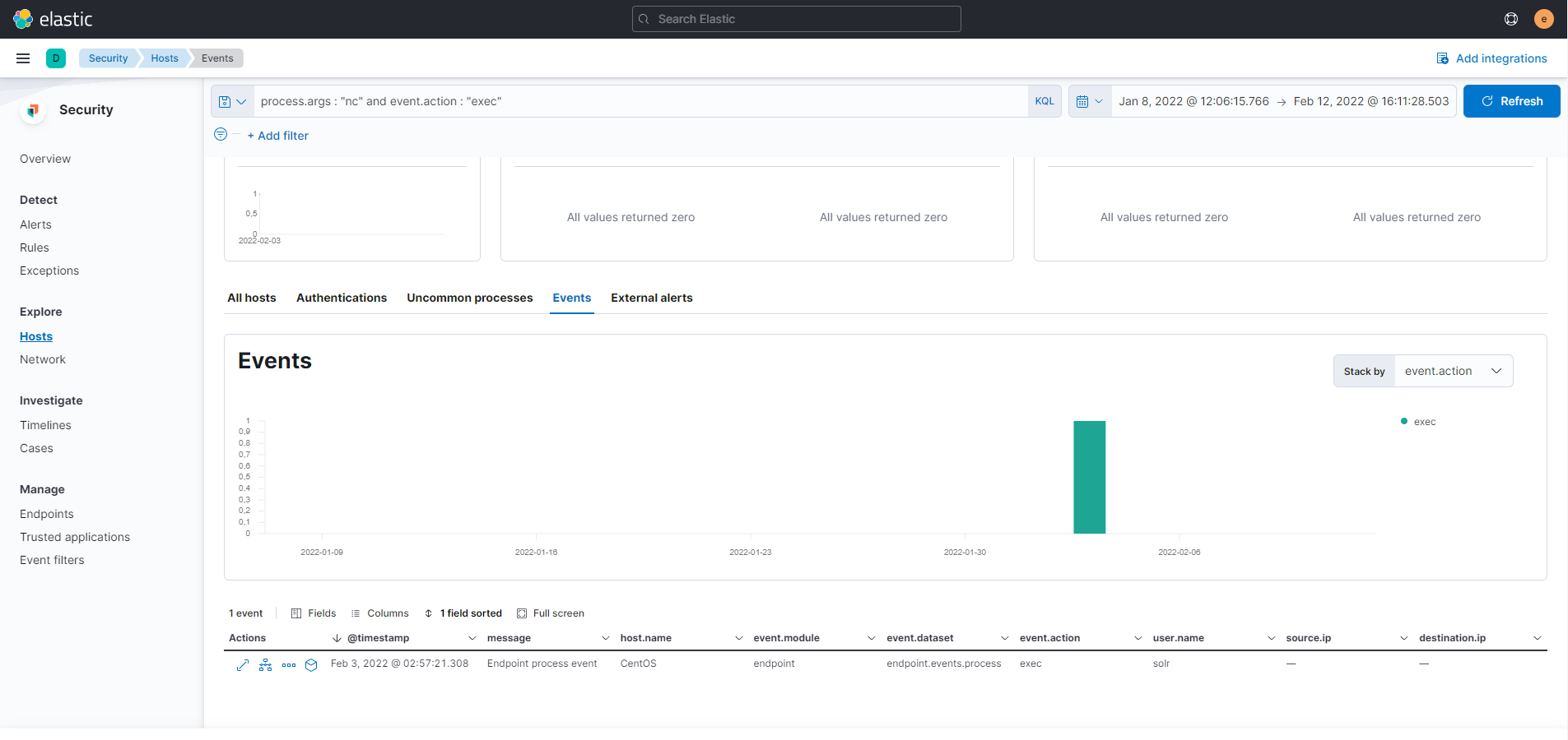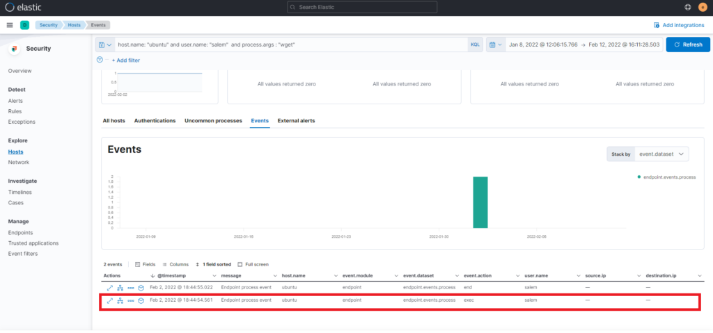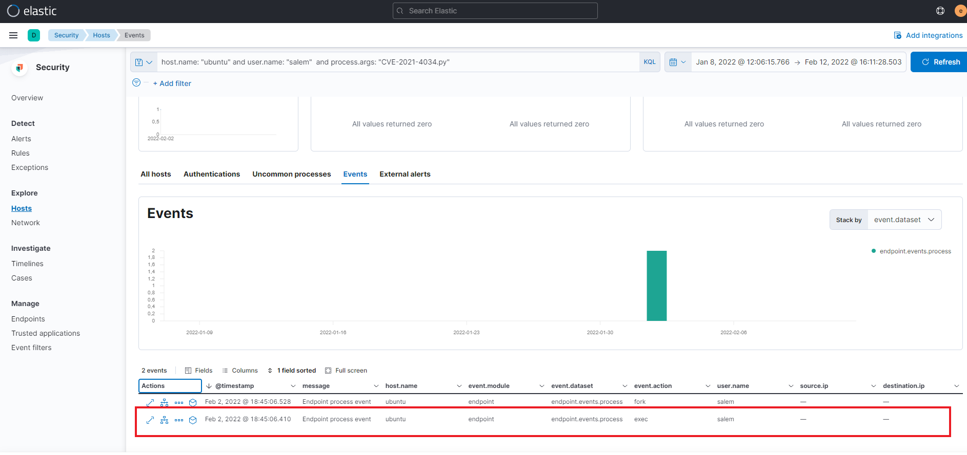 Nos vamos nuevamente a Security > Hosts > Event y filtramos por el PID y el usuario proporcionado