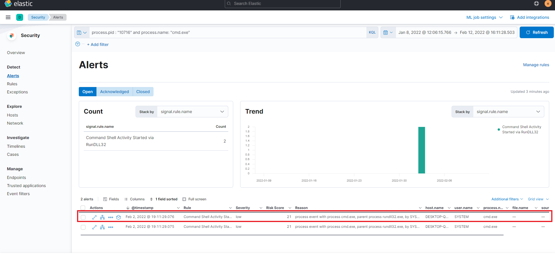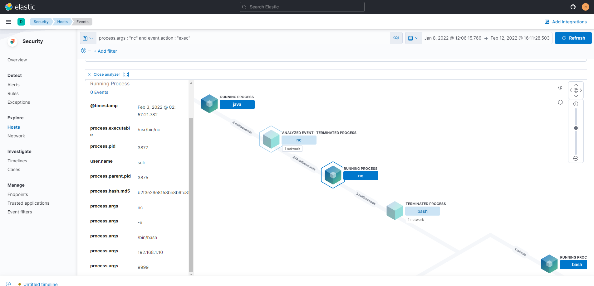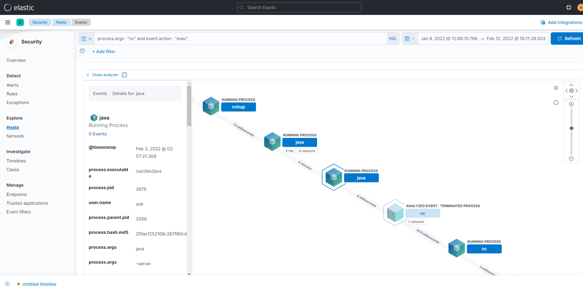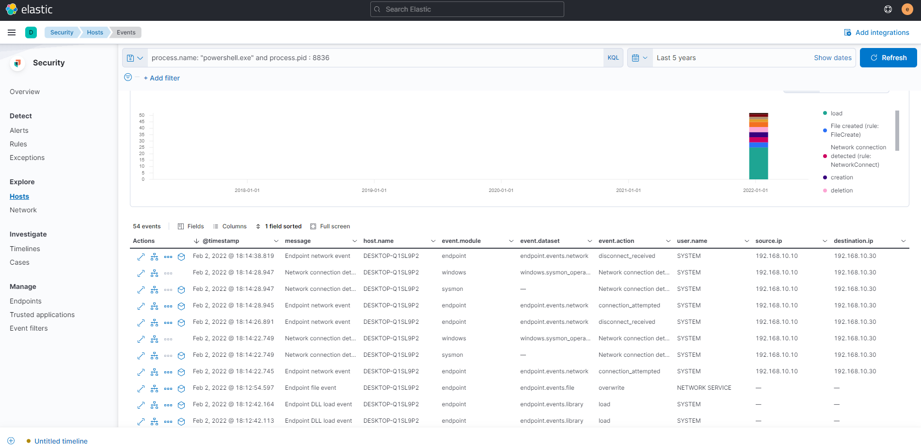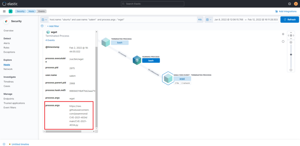 Nos vamos nuevamente a Security > Hosts > Event y filtramos por el PID y el usuario proporcionado