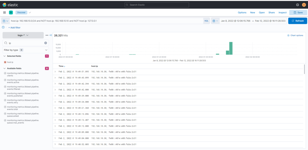 host.ip: 192.168.10.0/24 and NOT host.ip: 192.168.10.10 and NOT host.ip: 127.0.0.1