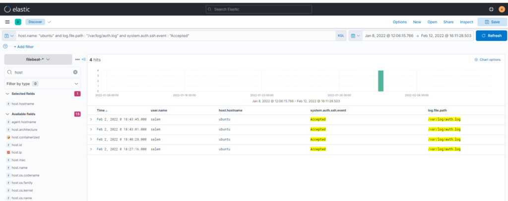 host.name: "ubuntu" and log.file.path : "/var/log/auth.log" and system.auth.ssh.event : "Accepted"