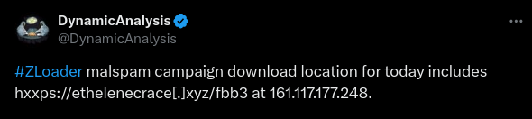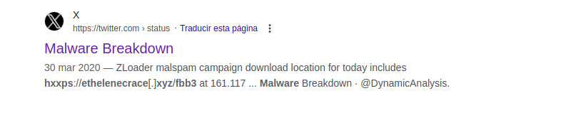 Búsqueda en Google: Utilicé la URL desde la que se descarga el malware (hxxps://ethelenecrace[.]xyz/fbb3) junto con el término «malware» para realizar una búsqueda en Google. Esta búsqueda me llevó a un post en Twitter que identificaba el malware como ZLoader.