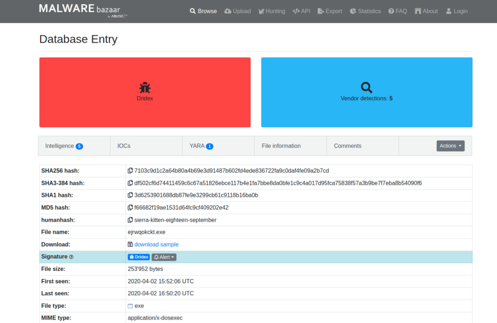 La consulta en MalwareBazaar confirmó que el archivo ixcxmzcvqi.exe pertenece a la familia de malware Dridex, un conocido troyano bancario utilizado para robar credenciales y realizar fraudes financieros.