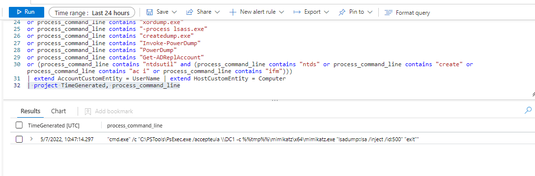 | where EventID == 1 and (process_command_line contains "Invoke-Mimikatz -DumpCreds"
