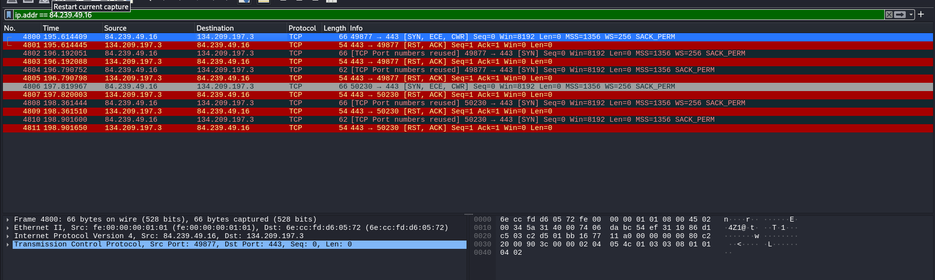 El registro de comunicación muestra múltiples intentos fallidos de establecer una conexión TCP desde la dirección IP 84.239.49.16 al puerto 443 en la dirección IP 134.209.197.3, típicamente utilizado para conexiones HTTPS. A pesar de varios intentos de conexión, cada solicitud del cliente es respondida por el servidor con un restablecimiento de la conexión (RST, ACK), indicando una negativa o incapacidad para establecer la conexión solicitada. Este patrón sugiere posibles problemas de conectividad o configuración en el servidor destino.